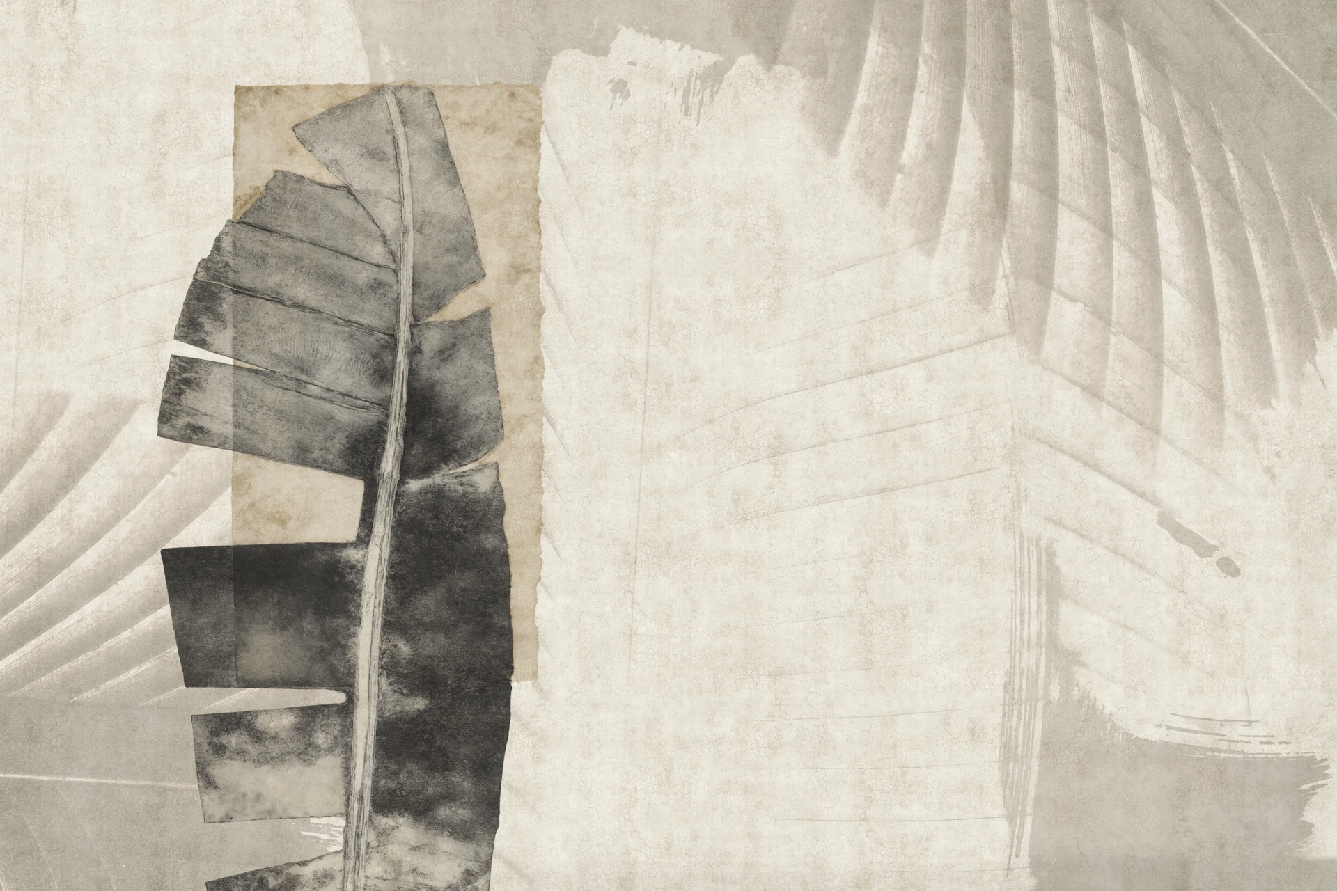 Grafika Glamora ARECA to abstrakcyjno-botaniczna kompozycja inspirowana formą liści palmowych, przedstawionych w powiększeniu i rozbitych na miękkie, rytmiczne pasma. Motyw łączy delikatny rysunek roślinny z warstwami przypominającymi ślady pędzla i przetartą powierzchnię, tworząc efekt lekkości i wizualnej głębi. Grafika występuje w kilku wariantach kolorystycznych — od chłodnych, jasnoszarych tonów po cieplejsze, piaskowe interpretacje — oraz w wersjach tła o subtelnej, mineralnej fakturze, które umożliwiają swobodne komponowanie spokojnych, wielkoformatowych aranżacji ściennych.