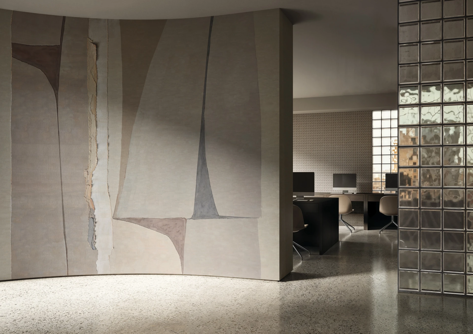 Grafika Glamora AVANE to abstrakcyjna kompozycja zbudowana z pionowych pasm i miękko wyciętych form, przypominających warstwowo nakładany papier lub organiczne bryły o nieregularnych krawędziach. Motyw operuje subtelnymi przejściami tonalnymi oraz delikatnymi kontrastami faktur, tworząc wrażenie głębi i spokojnego rytmu. Grafika występuje w kilku wariantach kolorystycznych, od jasnych, rozświetlonych szarości po głębsze, bardziej nasycone odcienie, a także w wersjach tła o drobnej, powtarzalnej strukturze, które pozwalają na swobodne budowanie harmonijnych, wielkoformatowych aranżacji ściennych.