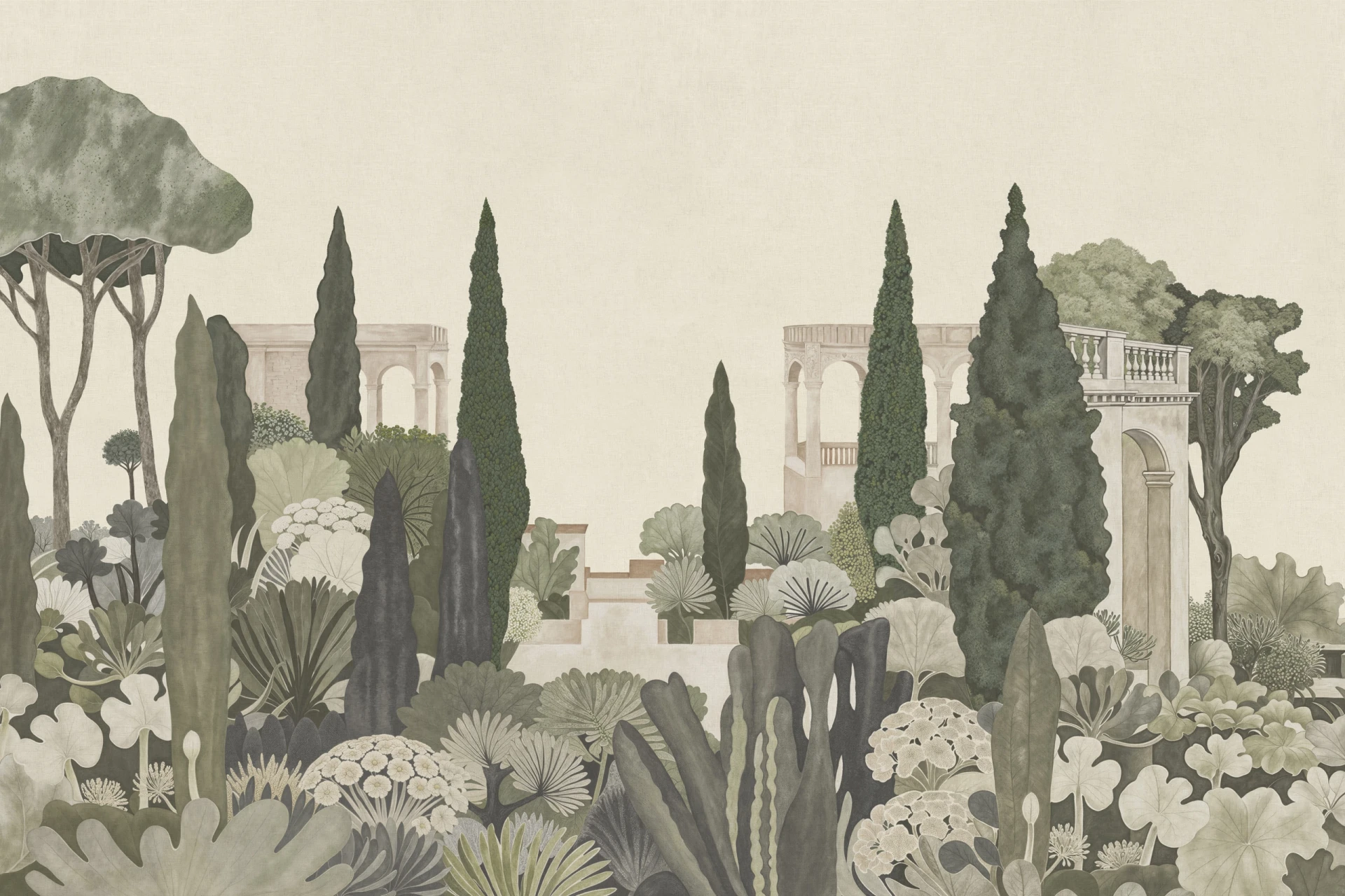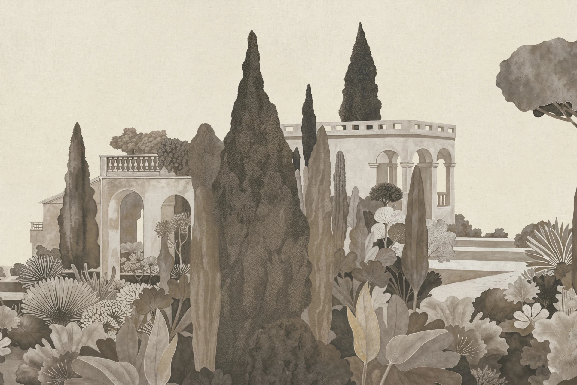 Grafika Glamora BELVEDERE to sceniczna, pejzażowa kompozycja, która przenosi na ścianę sugestię klasycznego ogrodu pełnego pergoli, cyprysów i agaw — przestrzeni otwartej, śródziemnomorskiej i wyciszonej, w której architektura z lekkimi arkadami spotyka się z miękkimi masami zieleni. Detaliczny rysunek roślinnych form i geometrycznych struktur splata się z delikatnymi płaszczyznami tła, tworząc narracyjną przestrzeń o głębi i rytmie, przywołującą widok na idealny, zawieszony w czasie teren. Grafika występuje w różnych wariantach kolorystycznych — od bardziej naturalnych, roślinnych tonów po stonowane, neutralne odcienie — oraz w wersjach uzupełniających tła, które umożliwiają swobodne komponowanie harmonijnych, wielkoformatowych aranżacji ściennych.