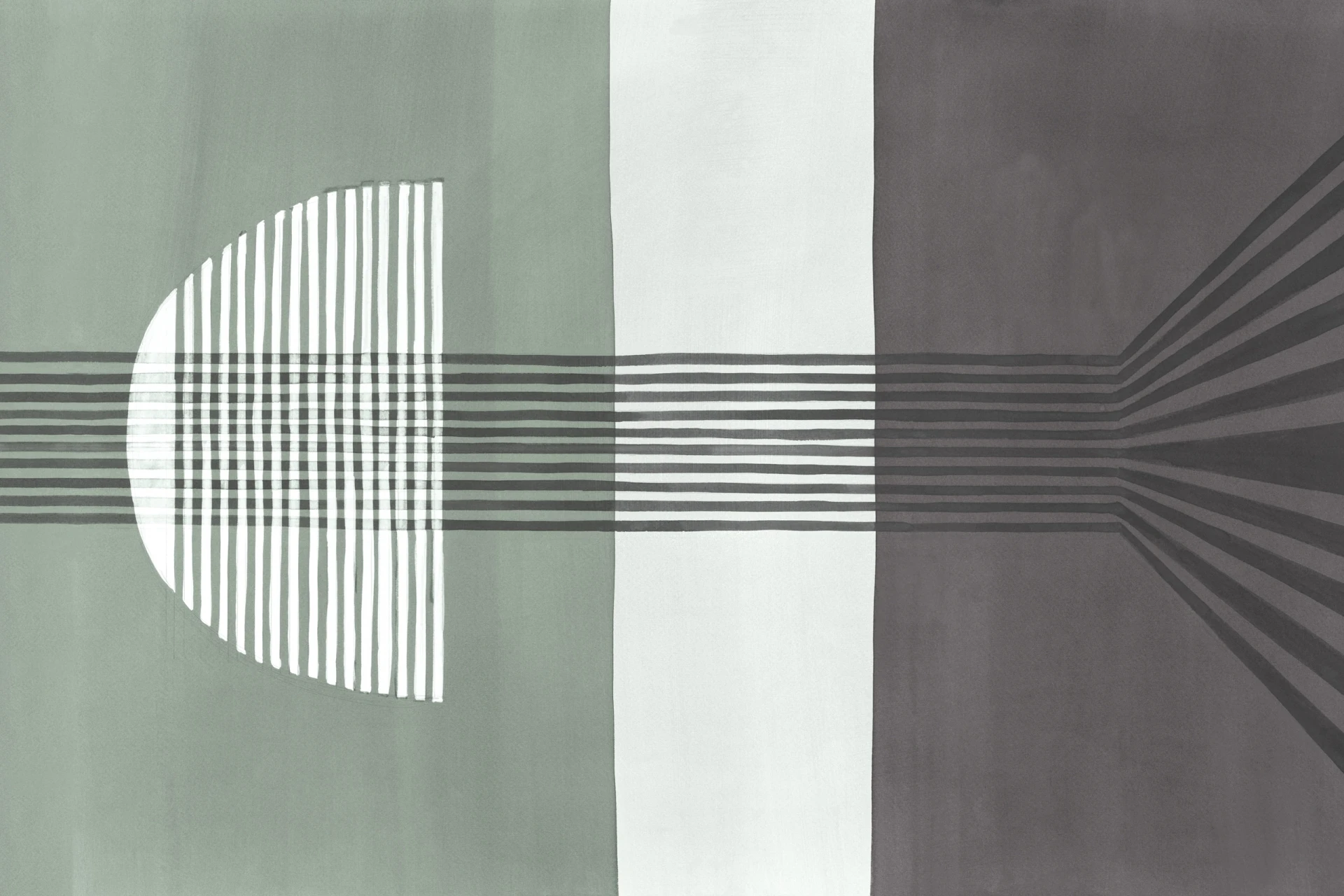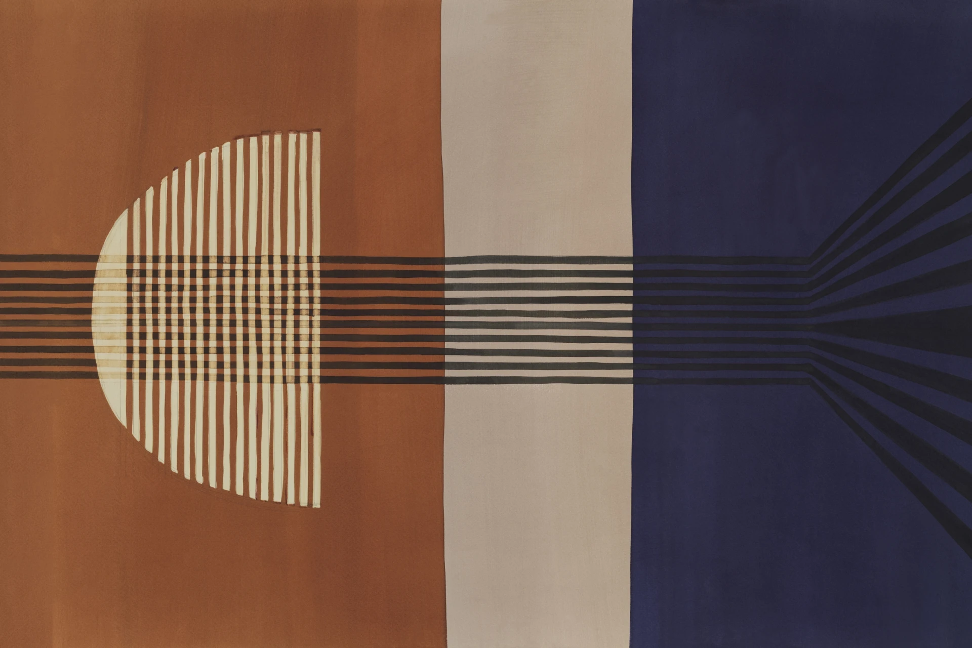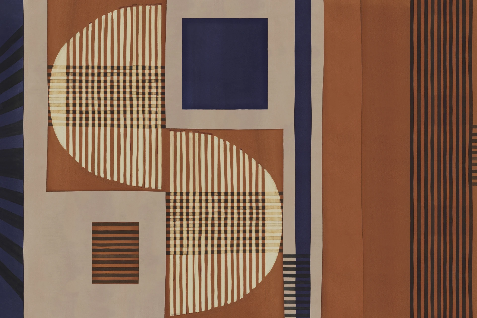 Grafika Glamora TERRACINA to abstrakcyjna kompozycja budowana wokół spotkania półokręgu przełamanego rytmicznymi liniami oraz zwartymi pasmami przecinanymi horyzontalnymi śladami, które prowadzą się jak fale dźwiękowe, rozprzestrzeniając i skupiając rytm formy. Pełne pola zestawione z liniowymi akcentami definiują intensywną, kierunkową ikonografię o zdecydowanym charakterze, w której geometria i rytm tworzą współczesny totem obecności scenicznej. Grafika występuje w wariantach kolorystycznych oraz w wersjach uzupełniających — abstrakcyjnych mikro-patternach i neutralnych tłach o subtelnej fakturze — które umożliwiają komponowanie spójnych, wielkoformatowych aranżacji ściennych.