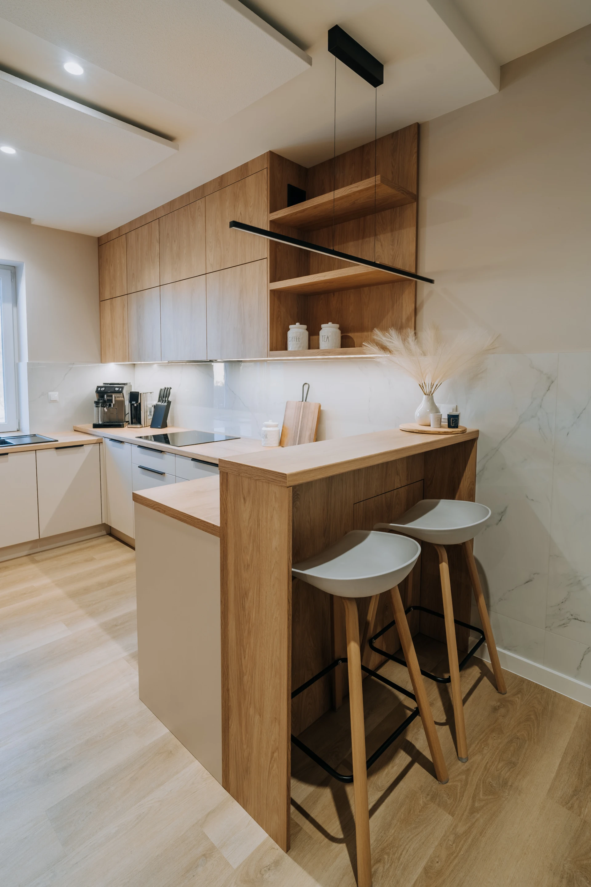 Blat, półki i detale dekoracyjne ocieplają minimalistyczną geometrię. Podświetlenia podszafkowe dodają lekkości, a przeszklona witryna w tle wprowadza element domowej codzienności – szkło, ceramika, drobne przedmioty.