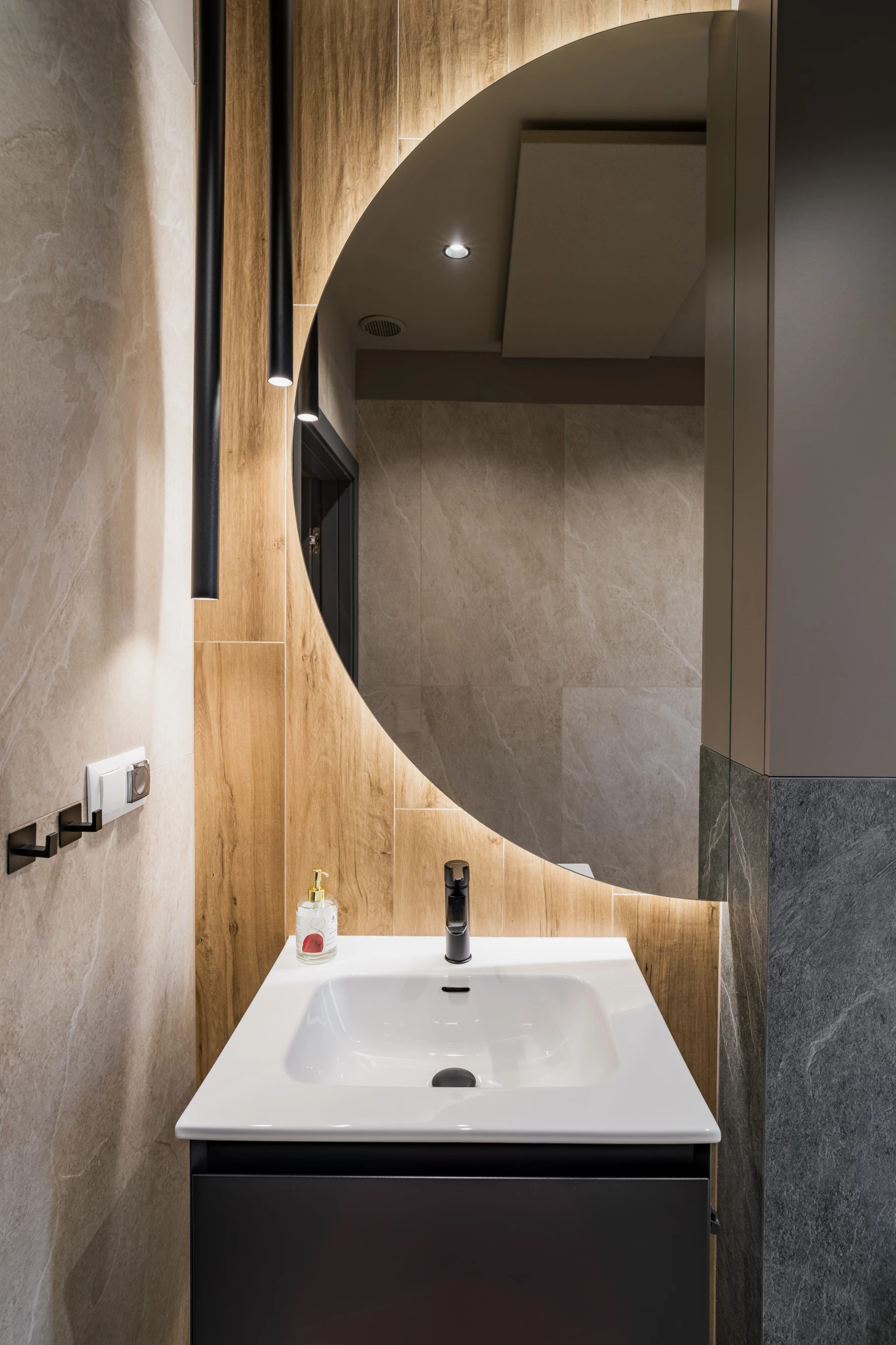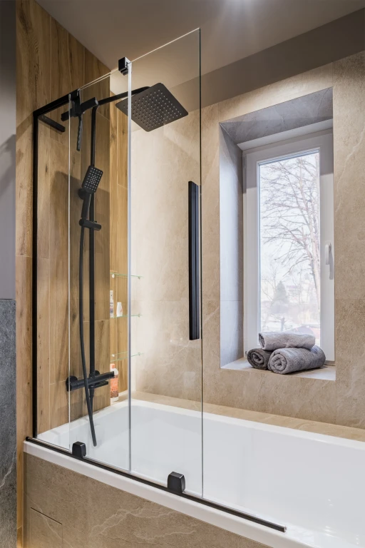 Beżowe płytki, struktura kamienia, ciepło drewna i czarna armatura budują nowoczesny, ale przytulny klimat. Wanna połączona z funkcją prysznica pozwala korzystać z przestrzeni elastycznie – szybko rano, spokojnie wieczorem.