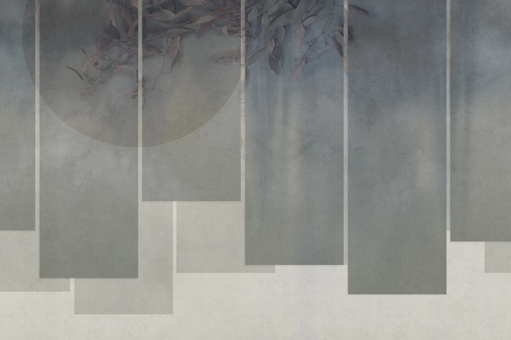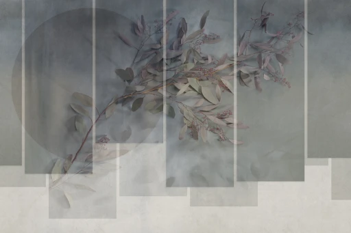 Kolorystyka grafiki opiera się na zgaszonych szarościach, przydymionych zieleniach i ciepłych, kamiennych beżach. To paleta, która nie dominuje wnętrza, lecz je dopełnia – dobrze współpracuje z naturalnymi materiałami, miękkimi tkaninami i spokojną architekturą przestrzeni.