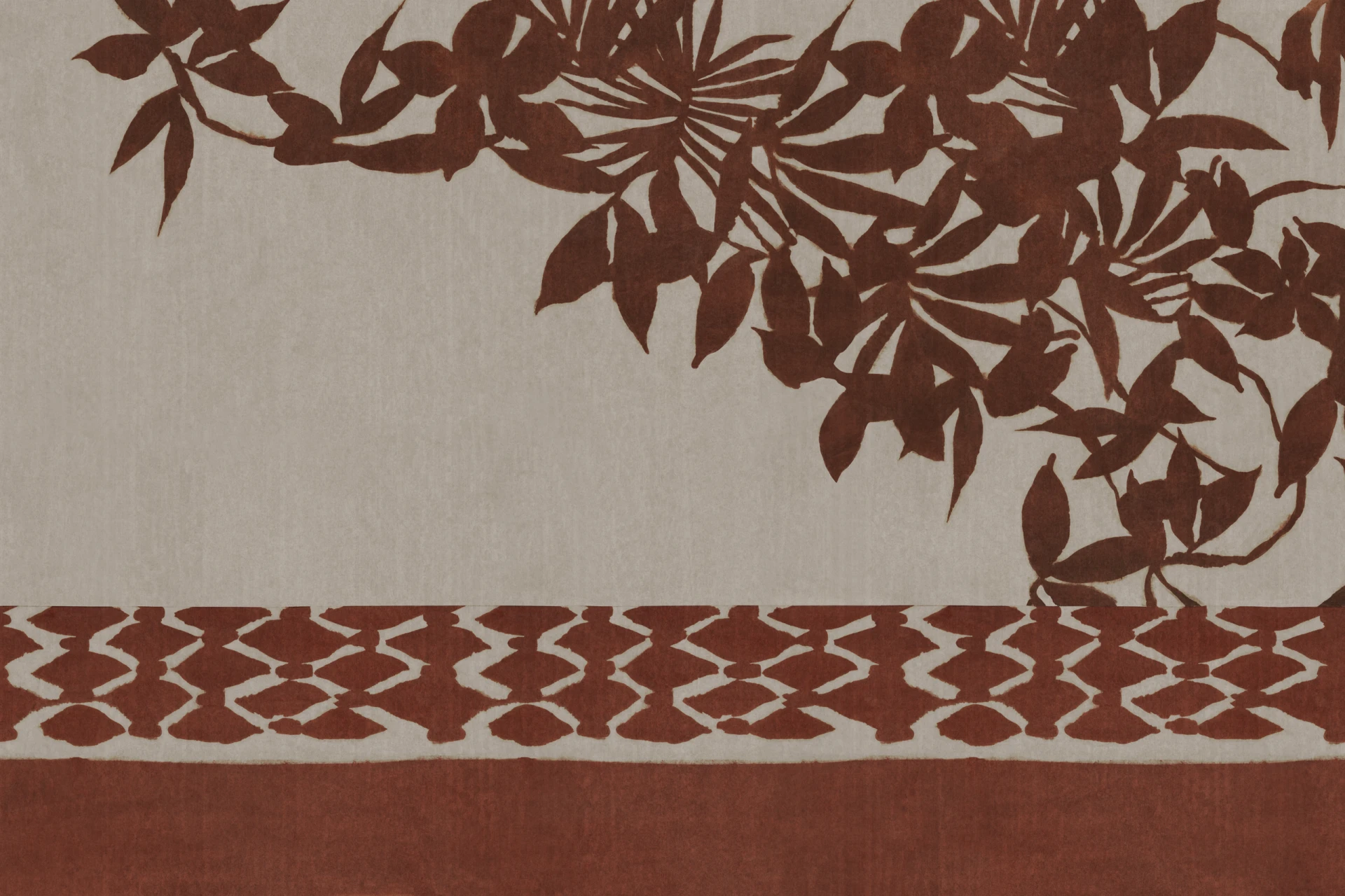 „Bohème Fleur” nie opowiada dosłownej historii roślin. Sylwetki liści są uproszczone, niemal cieniowe, tworząc dekoracyjny wzór przypominający nadruk na tkaninie lub ręcznie malowany mural. Motyw rozwija się w górnej części ściany, pozostawiając przestrzeń na „oddech” i światło.