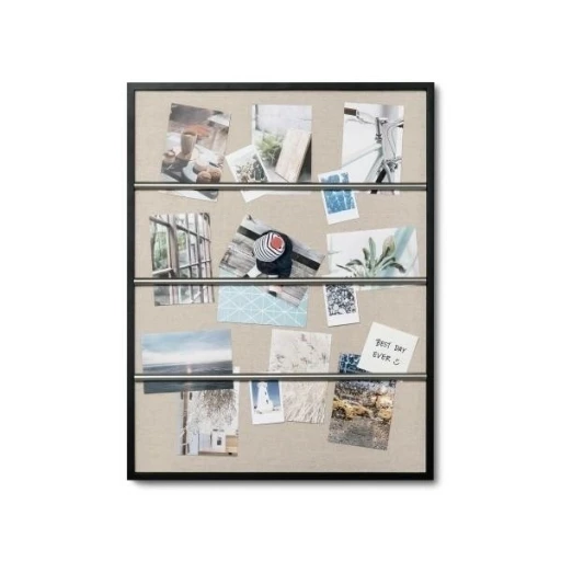Ekspozytor do zdjęć Umbra Tucker, czarny. Stwórz wyjątkową kompozycję z ulubionych grafik i zdjęć, która zaciekawi Twoich gości i spersonalizuje Twoje wnętrze.Ten nowoczesny ekspozytor został stworzony z prawdziwego płótna i ruchomych, odciąganych kołków na linkach. Takie rozwiązanie gwarantuje, że nie uszkodzisz swoich zdjęć i grafik pinezkami lub szpilkami. Cała rama została wykończona cienką, minimalistyczną listwą w czarnym kolorze, przez co ekspozytor odnajdzie się w wielu wnętrzach.Produkt można zawiesić pionowo jak i poziomo ciekawie aranżując pustą ścianę w biurze, kuchni lub korytarzu. Tablica z powodzeniem może również stać się miejscem do wymiany informacji między domownikami, lub interaktywną tablicą dla Twojego dziecka.