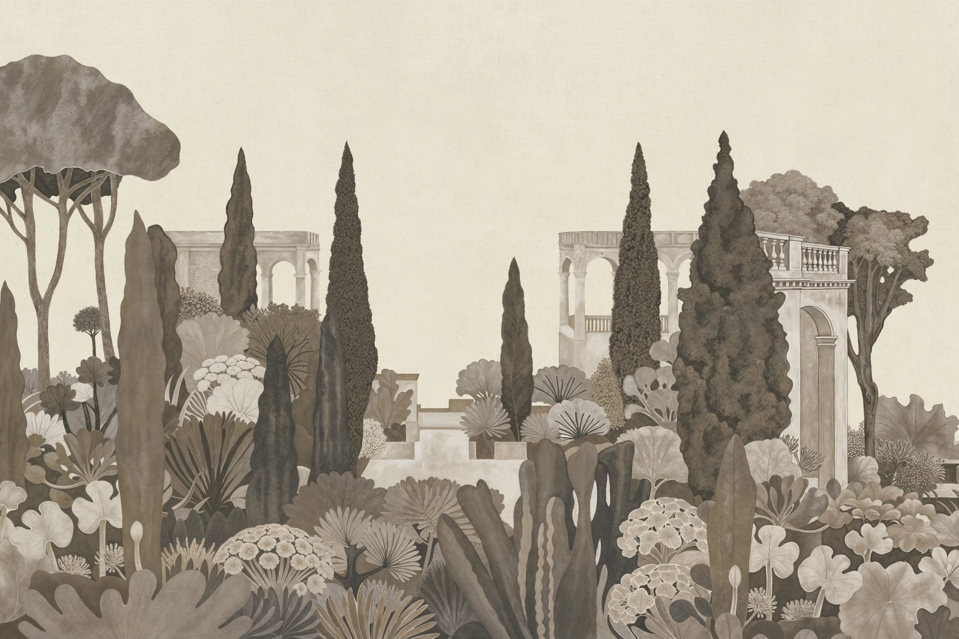 Grafika Glamora BELVEDERE to sceniczna, pejzażowa kompozycja, która przenosi na ścianę sugestię klasycznego ogrodu pełnego pergoli, cyprysów i agaw — przestrzeni otwartej, śródziemnomorskiej i wyciszonej, w której architektura z lekkimi arkadami spotyka się z miękkimi masami zieleni. Detaliczny rysunek roślinnych form i geometrycznych struktur splata się z delikatnymi płaszczyznami tła, tworząc narracyjną przestrzeń o głębi i rytmie, przywołującą widok na idealny, zawieszony w czasie teren. Grafika występuje w różnych wariantach kolorystycznych — od bardziej naturalnych, roślinnych tonów po stonowane, neutralne odcienie — oraz w wersjach uzupełniających tła, które umożliwiają swobodne komponowanie harmonijnych, wielkoformatowych aranżacji ściennych.