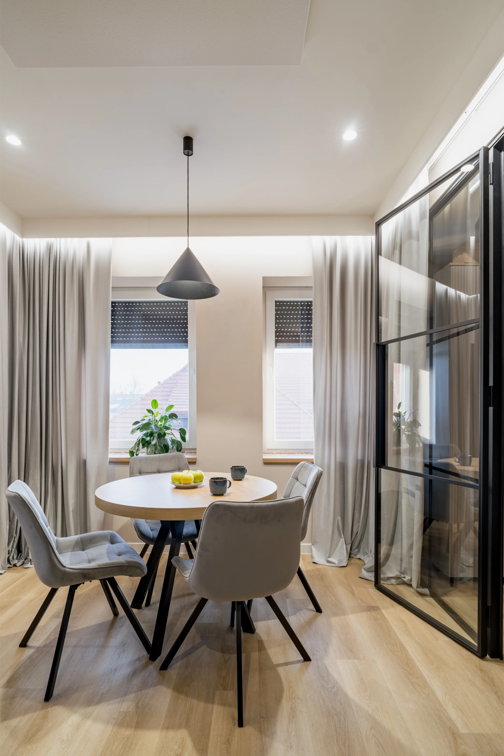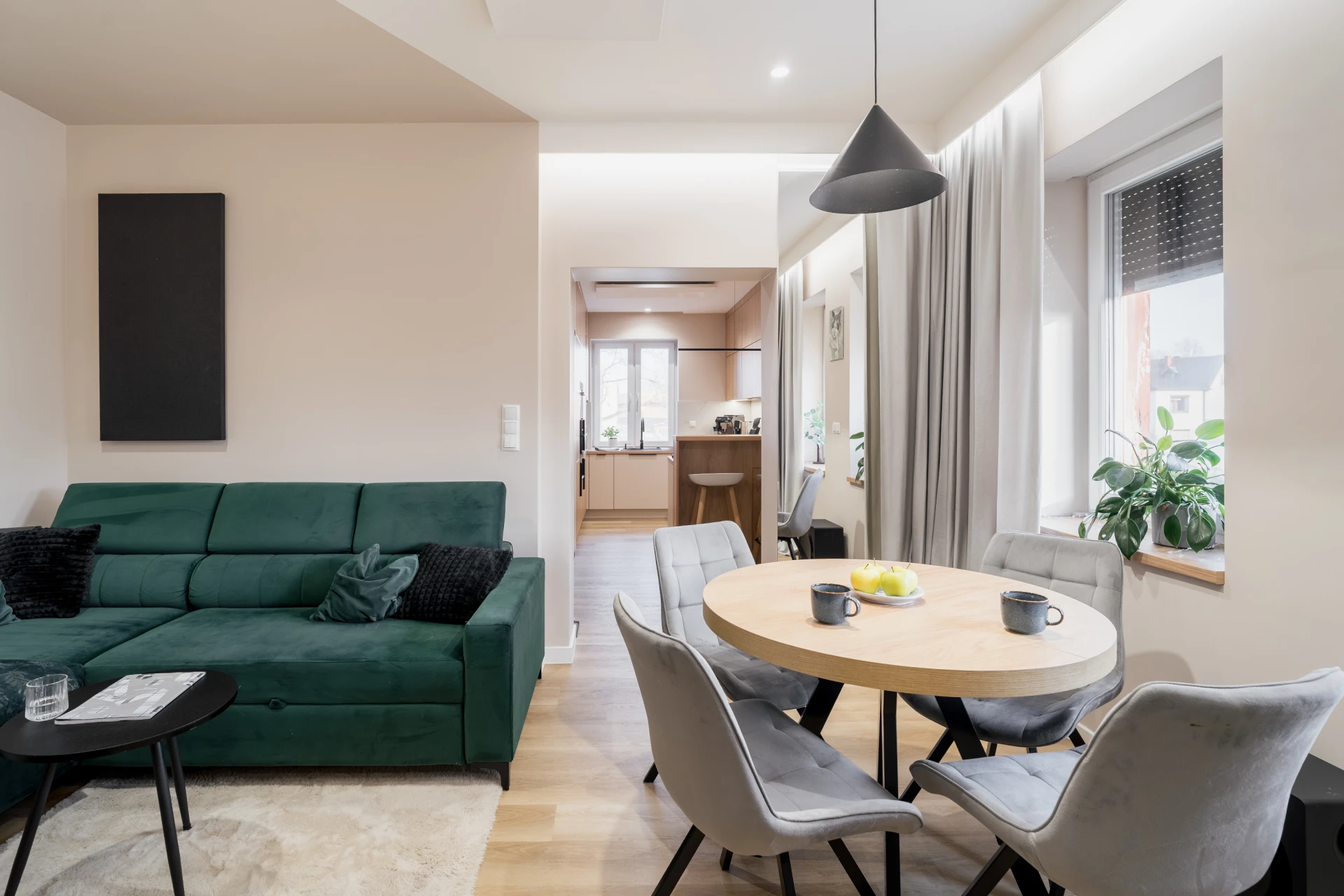Butelkowa zieleń sofy wnosi głębię, ale nie dominuje. Okrągły stół z tapicerowanymi krzesłami zachęca, by przysiąść dłużej – na kawę, rozmowę, chwilę pracy. Nad nim prosta, czarna lampa, która rysuje wyraźny punkt w przestrzeni.