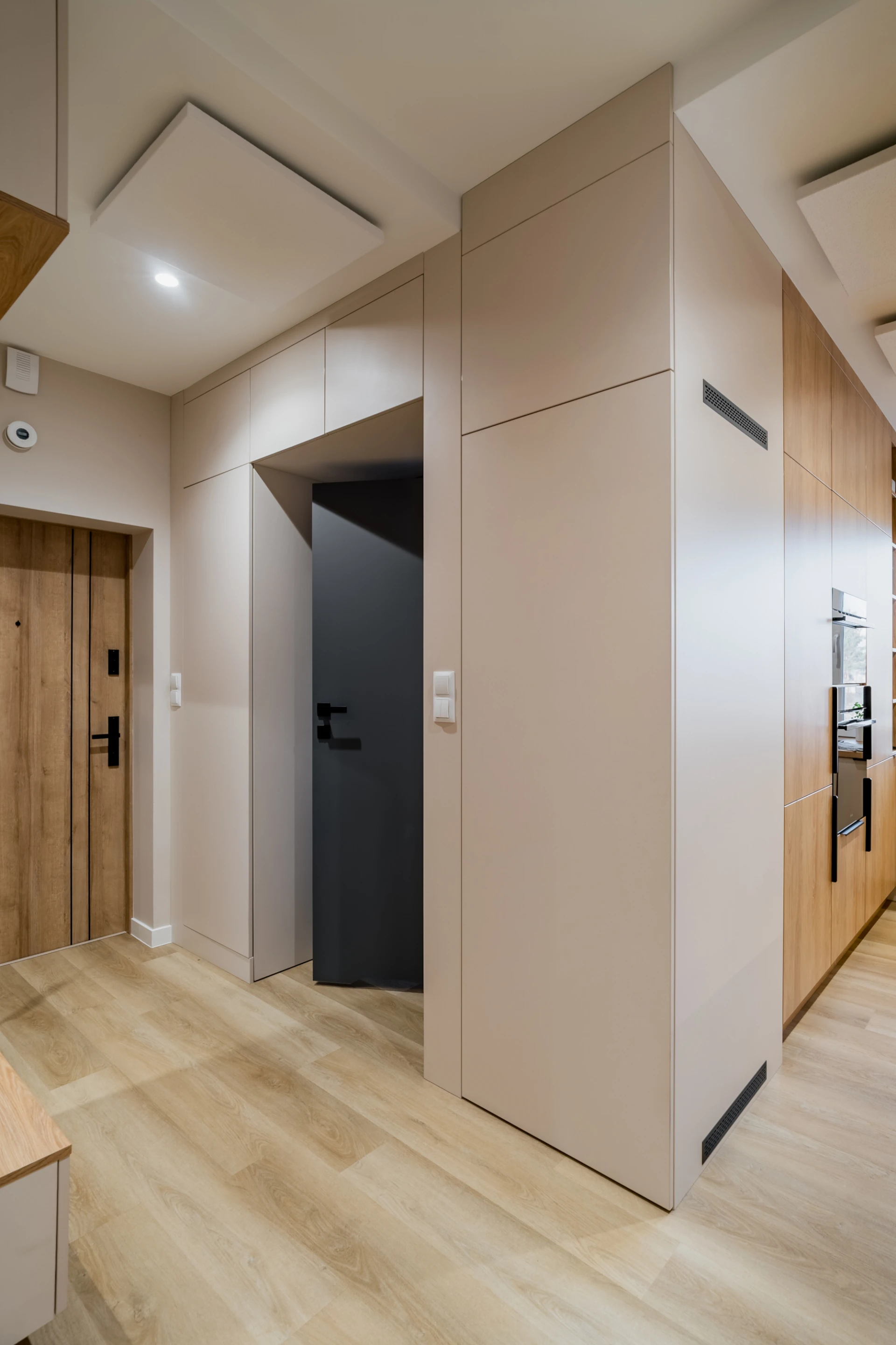 Zabudowy prowadzone są tu dwutorowo: jasne, gładkie fronty dolne oraz ciepłe, drewniane powierzchnie wysokich szaf. Kontrast jest czytelny, ale miękki.