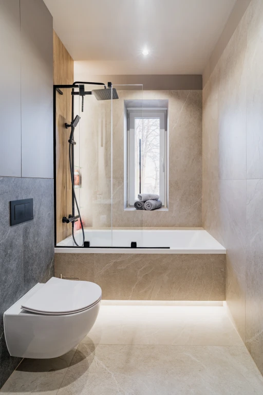 Beżowe płytki, struktura kamienia, ciepło drewna i czarna armatura budują nowoczesny, ale przytulny klimat. Wanna połączona z funkcją prysznica pozwala korzystać z przestrzeni elastycznie – szybko rano, spokojnie wieczorem.