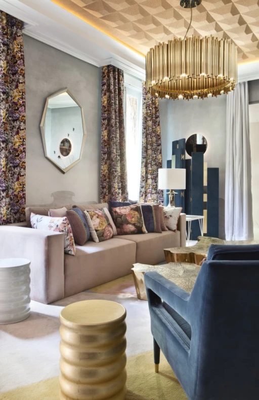 Madrycki apartament już od progu wita różnorodnymi materiałami, fakturami oraz barwami. Złoto, miedź, marmur, drewno spotykają się tutaj z aksamitnymi tkaninami, którymi pokryto sofę i fotele, miękkimi poduszkami, zasłonami czy narzutami. Pastelowe kolory przełamane zostały intensywniejszym granatem, pomarańczą i zielenią, a następnie ożywione floralnymi i geometrycznymi wzorami.