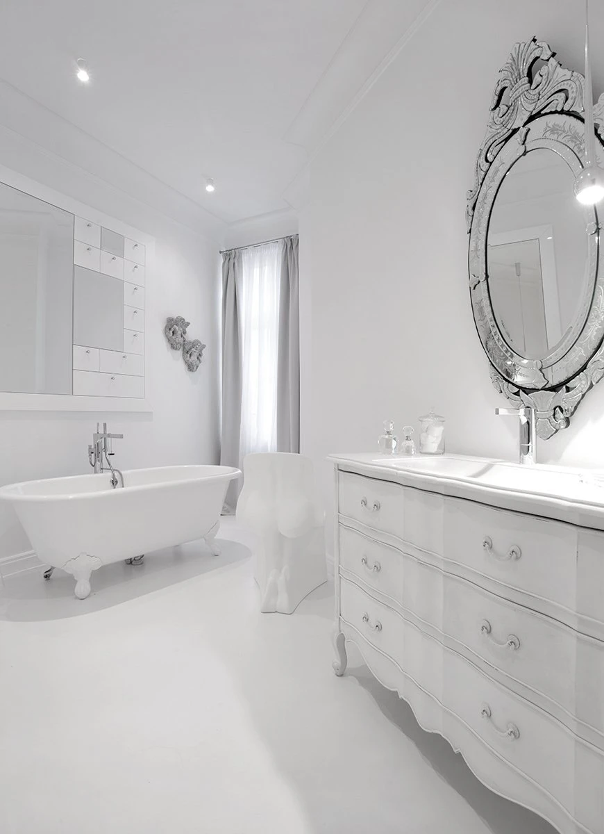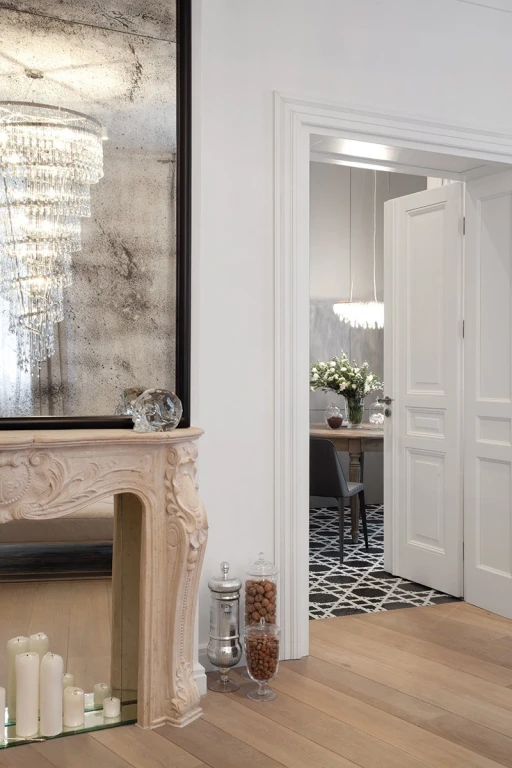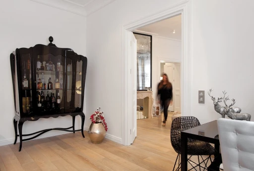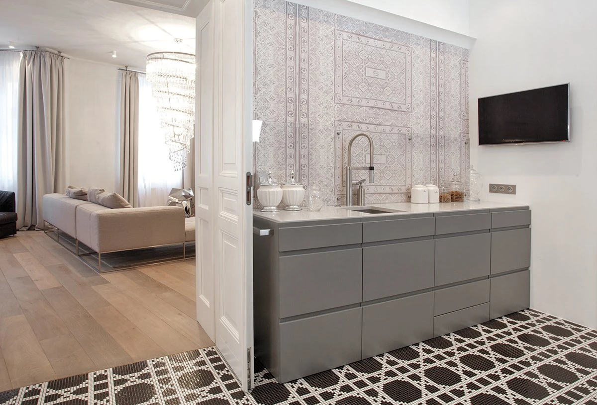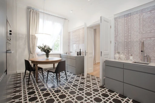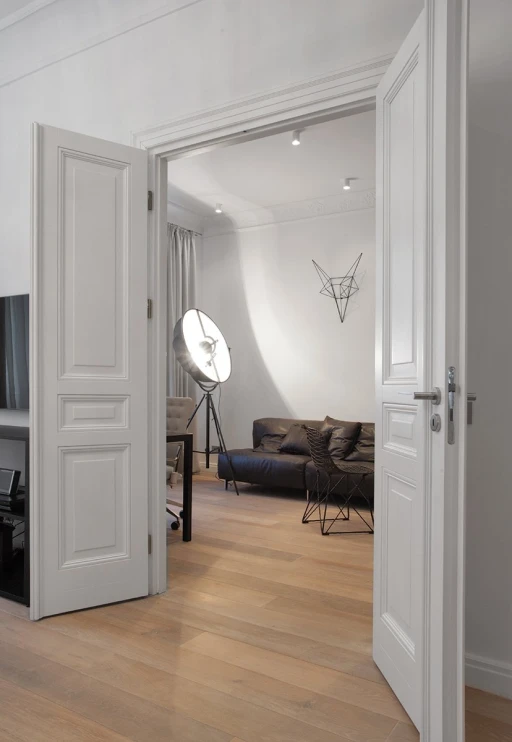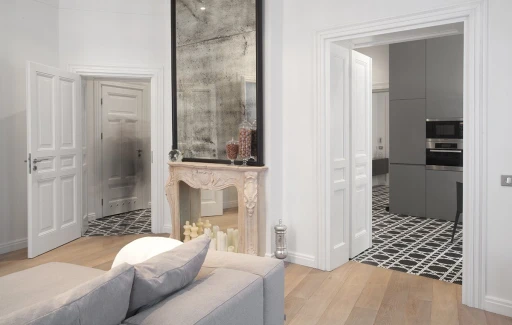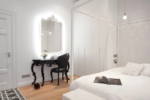 Jasno sprecyzowanym założeniem od początku było uszanowanie charakteru miejsca połączone z zamiłowaniem właścicieli do nietuzinkowych, luksusowych przedmiotów współczesnego designu. Dlatego - obok skrupulatnie odtworzonych sztukaterii, kryształowych żyrandoli, pięknej postarzanej podłogi drewnianej - pojawiło się tu na przykład jedyne (jak dotąd) w Polsce indywidualnie wykonywane i sygnowane krzesło młodego projektanta Zhanga Zhoujie, podejmujące dialog z przeszłością stylowe, ale obudowane świetlówkami lustro Lee Broom’a w sypialni czy mozaika Bisazza dająca efekt niezwykle dekoracyjnego dywanu wyznaczającego obszar kuchni i korytarzy. Także kolorystyka wnętrz została jasno określona przez właścicieli – miała być stonowana, bez silnych akcentów kolorystycznych, bazująca na czerni, bieli i szarościach. Amfiladowy układ pomieszczeń z góry narzucił podział funkcjonalny apartamentu – z hall mamy dostęp do salonu, łazienki gościnnej, kuchni oraz małej garderoby. Do salonu przylega kolejny pokój przeznaczony do przyjmowania gości. Kuchnia i salon są ze sobą połączone dodatkowym przejściem. Z kuchni przechodzimy do jadalni, a już kolejne drzwi za tym pomieszczeniem , to strefa prywatna właścicieli – obszerna garderoba i sypialnia z łazienką.