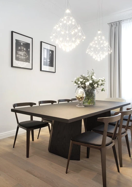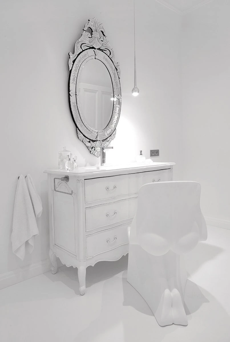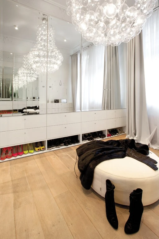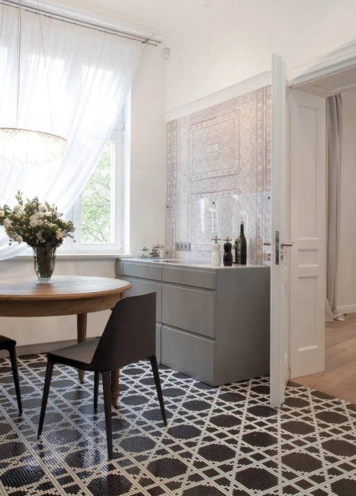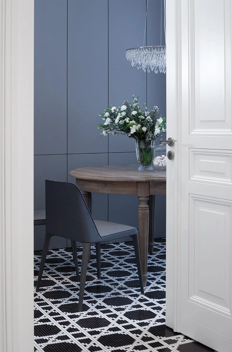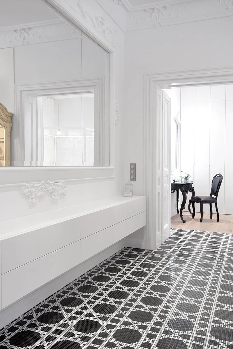 Jasno sprecyzowanym założeniem od początku było uszanowanie charakteru miejsca połączone z zamiłowaniem właścicieli do nietuzinkowych, luksusowych przedmiotów współczesnego designu. Dlatego - obok skrupulatnie odtworzonych sztukaterii, kryształowych żyrandoli, pięknej postarzanej podłogi drewnianej - pojawiło się tu na przykład jedyne (jak dotąd) w Polsce indywidualnie wykonywane i sygnowane krzesło młodego projektanta Zhanga Zhoujie, podejmujące dialog z przeszłością stylowe, ale obudowane świetlówkami lustro Lee Broom’a w sypialni czy mozaika Bisazza dająca efekt niezwykle dekoracyjnego dywanu wyznaczającego obszar kuchni i korytarzy. Także kolorystyka wnętrz została jasno określona przez właścicieli – miała być stonowana, bez silnych akcentów kolorystycznych, bazująca na czerni, bieli i szarościach. Amfiladowy układ pomieszczeń z góry narzucił podział funkcjonalny apartamentu – z hall mamy dostęp do salonu, łazienki gościnnej, kuchni oraz małej garderoby. Do salonu przylega kolejny pokój przeznaczony do przyjmowania gości. Kuchnia i salon są ze sobą połączone dodatkowym przejściem. Z kuchni przechodzimy do jadalni, a już kolejne drzwi za tym pomieszczeniem , to strefa prywatna właścicieli – obszerna garderoba i sypialnia z łazienką.