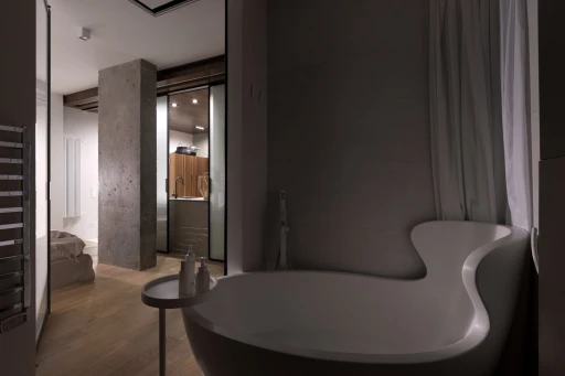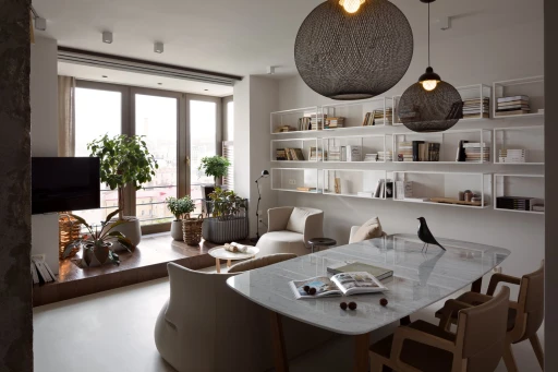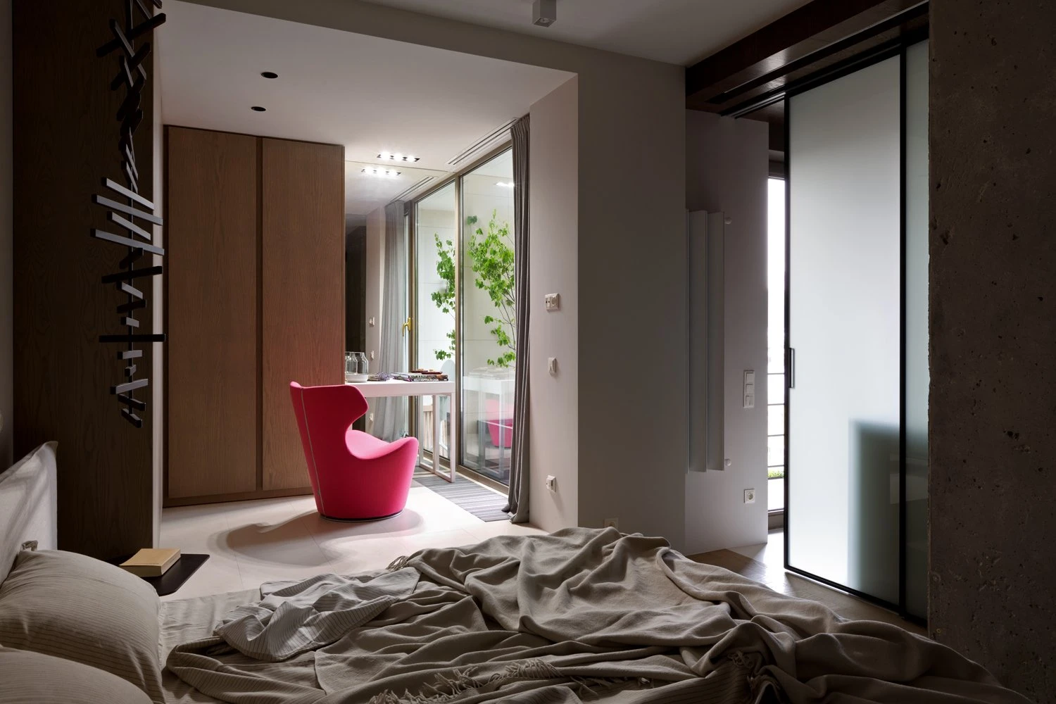 Ten projekt, jak inne prace Olgi Akulovej, perfekcyjnie łączy funkcjonalność z estetyką – wnętrza utrzymane są w harmonijnej gamie kolorystycznej, uważnie dobrane zostały materiały. Nas zachwyca pomysłowość tej bardzo utalentowanej ukraińskiej projektantki. Więcej o jej projektach: http://www.olgaakulova.com/.