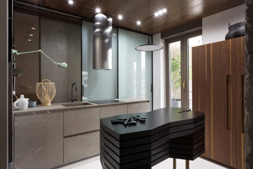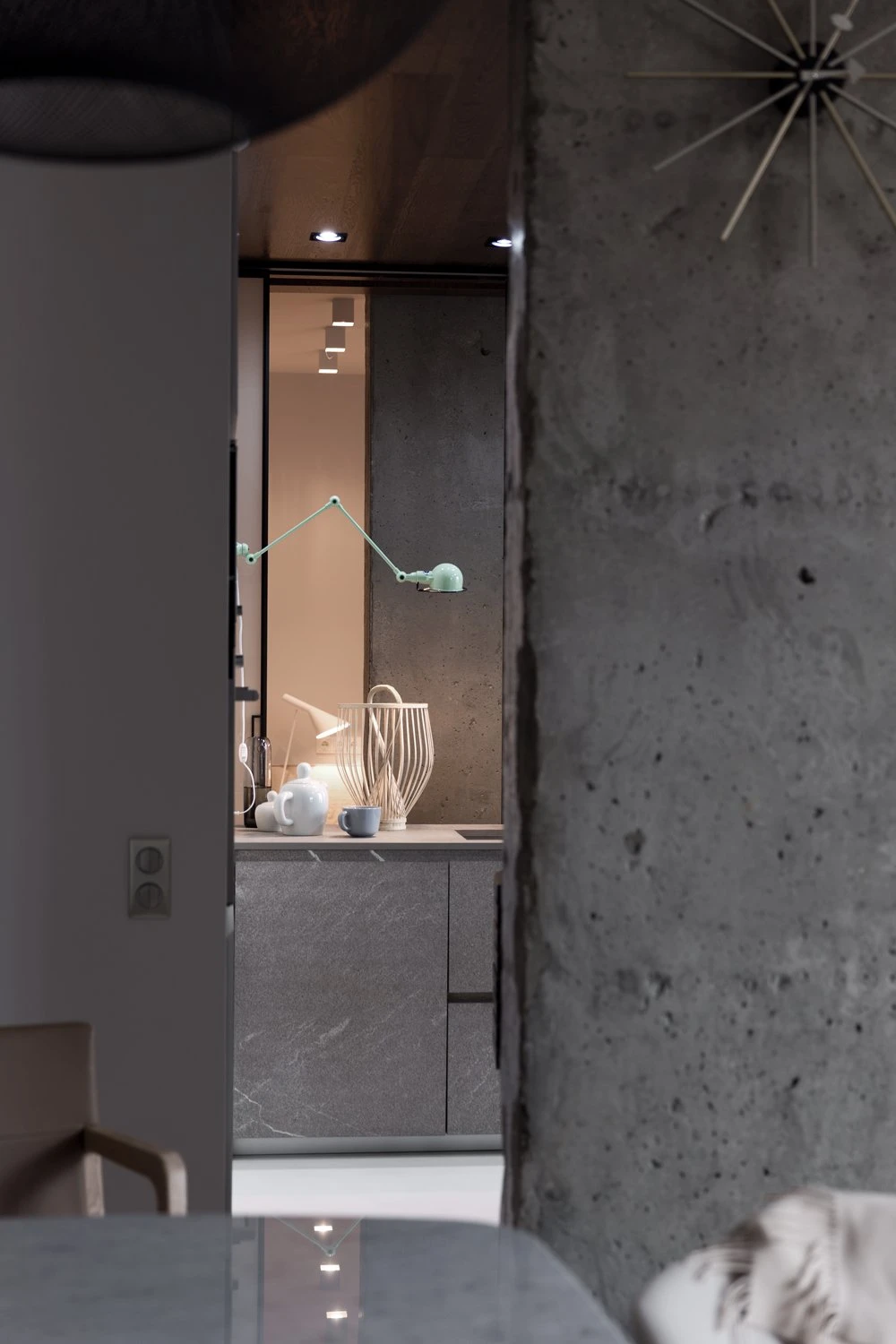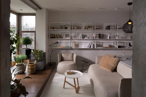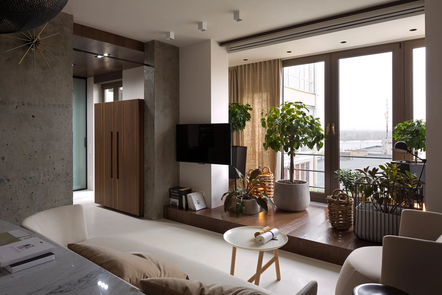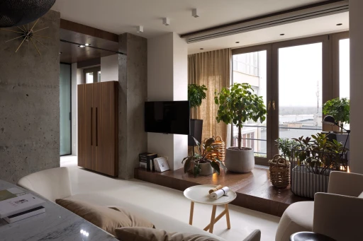 Wystarczyło spotkać się i omówić szczegóły. Potem było burzenie ścian, prace wykończeniowe, dobieranie mebli. Wyszło w stylu Kenzo? Zobaczcie sami. Przestrzeń mieszkania została podzielona na strefy funkcjonalne przy pomocy przesuwnych drzwi, kamiennej wyspy kuchennej i betonowej kolumny. Naturalna faktura betonu, biała podłoga z żywicy, drewno w części balkonowej i sufit w kuchni to elementy, które przybliżają całość do stylu wnętrz tworzonych przez Kenzo Maison. Swietłana jest zachwycona – i o to chodziło. Siedząc na sofie B&B Italia może podziwiać wewnętrzny ogród, jaki stworzyła dla niej projektantka, a sięgając wzrokiem za okno – obserwować Dniepr i zielone wzgórza. Idealne warunki do wypoczynku. I do pracy: za sofą stoi stół marki Poliform, który służy Swietłanie za biurko. Uwagę zwracają oryginalne półki na ścianie w pokoju dziennym zaprojektowane przez Olgę i zielona ściana w hallu. Jej odbicie w lustrze sprawia wrażenie niekończącego się korytarza.
