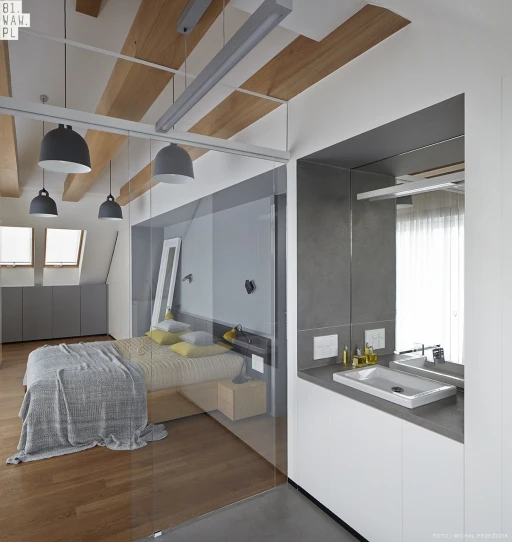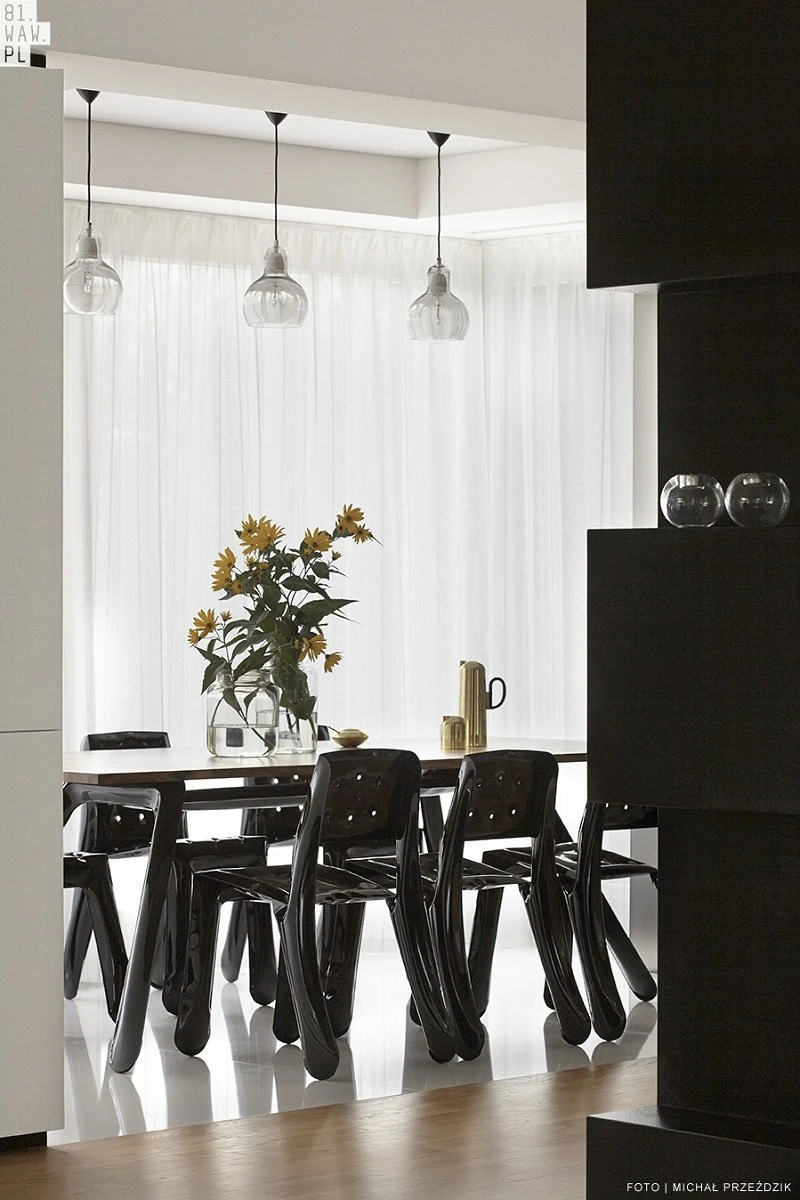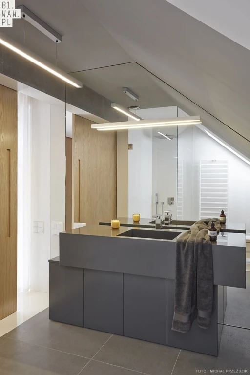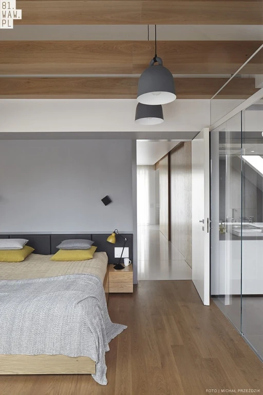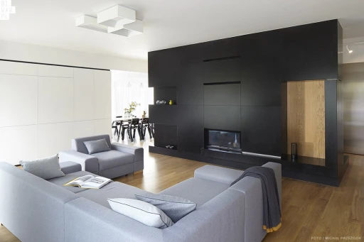 Dom został podzielony na dwie równe strefy: dzienną - obejmującą parter oraz nocną - zlokalizowaną na piętrze. Pierwszą z nich zajmuje salon z jadalnią, kuchnia, spiżarnia, toaleta oraz gabinet. Centralnym punktem, wokół którego zorganizowana została przestrzeń dzienna jest duża, czarna bazaltowa bryła, która kryje m.in. kominek. To serce całego parteru, wokół którego rozplanowane są pozostałe pomieszczenia, to miejsce gdzie spotykają się domownicy i goście. Od strony kuchni bryła zmienia się w drewnianą kostkę z przeszkleniami - tu mieszczą się schody. Na piętrze znajdziemy długi hol, pokoje dla dzieci, łazienkę i główną sypialnię połączoną z łazienką. Drewniana zabudowa ścian holu pozwoliła optycznie poszerzyć wąskie pomieszczenie, zaś ledowe oświetlenie w podwieszanym i napinanym suficie typu barrisol rozjaśniło pozbawiona naturalnego światła przestrzeń. Ciekawym rozwiązaniem jest połączenie sypialni z przeszkloną łazienką i garderobą. Pomieszczenia są oddzielone od siebie, ale dzięki zastosowaniu przeźroczystego materiału tworzą ogromną, otwartą przestrzeń. W sypialni znalazło się miejsce na industrialne lampy w skali XL. W przeciwieństwie do reszty domu, tutaj dominują odcienie szarości, ocieplone drewnem, które znajdziemy zarówno na podłodze, jak i meblach czy na czy widocznych elementach konstrukcyjnych dachu. Dzięki konsekwencji stylistycznej powstało idealnie spójne i harmonijne wnętrze – dla miłośników prostej i ciepłej elegancji.