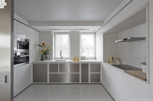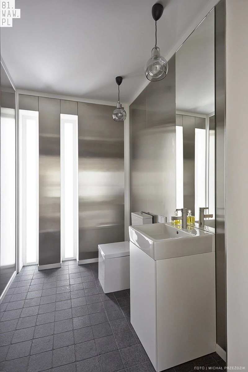 Podstawowym pragnieniem gospodarzy była przestrzeń. Chcąc ją powiększyć, także optycznie, projektantka zastosowała wiele prostych rozwiązań i trików charakterystycznych dla stylu skandynawskiego. Architektka zdecydowała maksymalnie otworzyć wszystkie pomieszczenia i, tam gdzie było to możliwe, zrezygnować ze ścianek dzielących wnętrze. Balustradę schodów zastąpiła szklana tafla. Skandynawskie wnętrza są jasne i widne, dlatego dominującym kolorem i bazą wykończenia jest tu biel. To główny kolor w łazience i kuchni. Odnajdziemy go także na panelach ściennych, podłodze w holu czy na ścianach. Biel dominuje, ale nie przytłacza pomieszczeń. Uzupełniają ją i przełamują szare, czarne i stalowe dodatki. Motywem przewijającym się przez całe wnętrze jest też szczotkowana stal. Użyto jej do obicia drzwi we wszystkich pomieszczeniach, jest dominująca w wystroju łazienki dla gości, a w kuchni dumnie zdobi białe fronty zabudowy. Połączenie bieli i stali to prosty sposób na uzyskanie eleganckich pomieszczeń, które są nie tylko pięknie, ale też bardzo praktyczne. Lekko industrialną kombinację ociepliło drewno, uniwersalny materiał, który pasuje do każdego stylu. W tym wnętrzu nie zabrakło też charakterystycznych dla stylu skandynawskiego geometrycznych kształtów. Widoczne są w prostych bryłach mebli, elementach wykończenia domu i dodatkach.