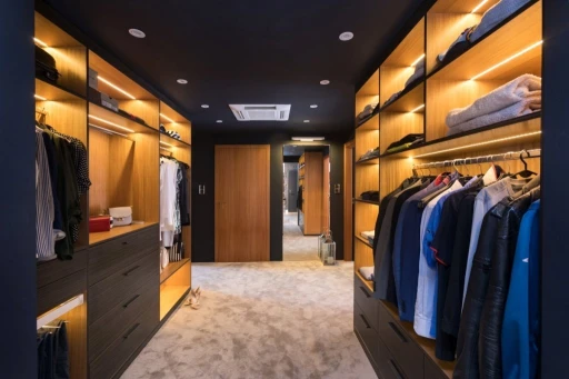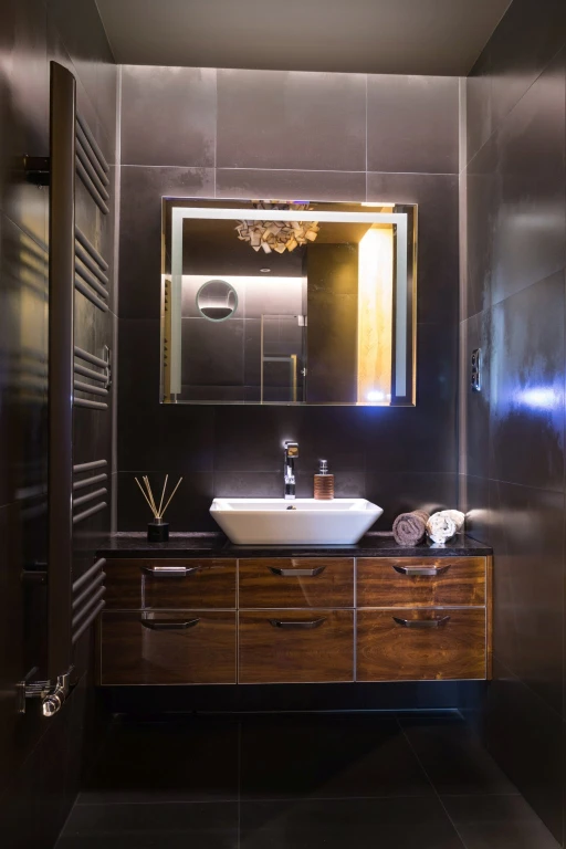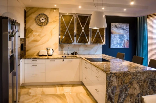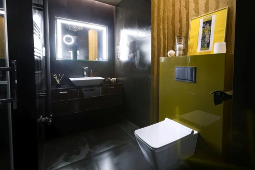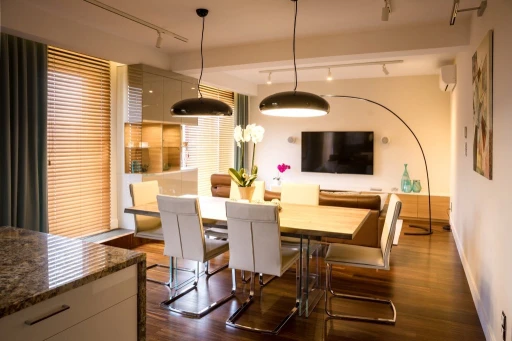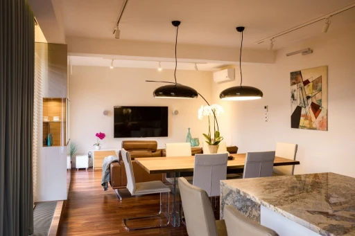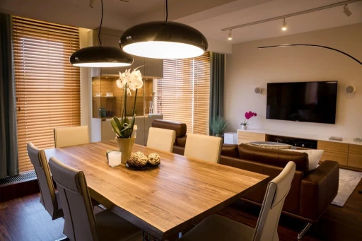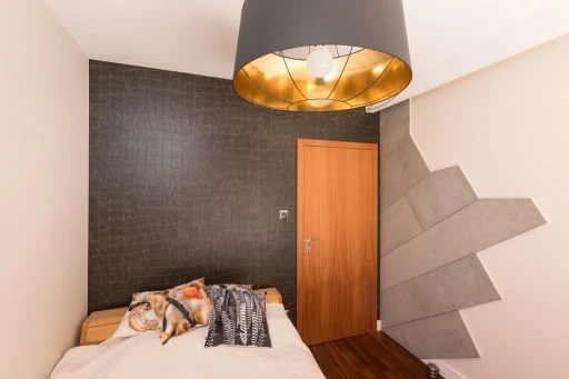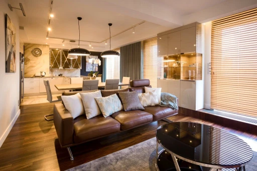Nowoczesne apartamenty często odbierane są jako bardzo zimne i surowe. W rzeszowskim mieszkaniu nowoczesność ma jednak bardzo ciepłą i przytulną odsłonę. Architekci połączyli materiały o różnych temperaturach i fakturach, tak by uniknąć niepożądanego wrażenia chłodu i sterylności. Wszechobecne w mieszkaniu: kamień (pod postacią płytek podłogowych, granitu na blatach kuchennych), beton architektoniczny użyty jako dekoracja w gościnnej sypialni, skórzana tapicerka sofy BoConcept w salonie zostały zmiękczone egzotycznym olejowanym drewnem denya, a także puszystą wykładziną Epic Carpets (dystrybuowane przez Dekorian) położoną w garderobie. Również paletę barw skomponowano z myślą o zachowaniu idealnych proporcji. Szarości, grafity i biel otrzymały przeciwwagę dzięki wprowadzeniu ciepłych odcieni drewna czy mosiądzu. Jednak to światło odegrało najważniejszą rolę w zbudowaniu atmosfery tego apartamentu. Architekci zaplanowali bardzo różnorodne punkty – lampy stojące, kinkiety, żyrandole, źródła pojedyncze i listwy (np. marki BPM Lighting z Dekoriana), za pomocą których mieszkańcy mogą rzeźbić przestrzeń i nastrój. Otulają one pomieszczenia i detale bursztynowym blaskiem.