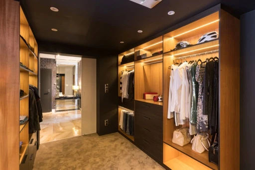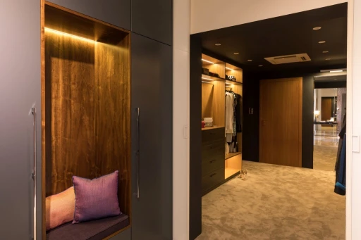 Apartament zlokalizowany na ostatnim piętrze osiedla w Rzeszowie ma 100 metrów kwadratowych, a jego powierzchnię wzbogacają dwa duże tarasy z pięknym panoramicznym widokiem. Architekci z biura projektowego Viva Design zaproponowali podzielenie tej okazałej przestrzeni na dwie strefy: prywatną i dla odwiedzających małżonków dzieci oraz gości. Część wspólna, składająca się z hallu, znajdującej się po lewej stronie od wejścia łazienki oraz salonu połączonego z jadalnią i kuchnią, płynnie przechodzi w intymną. Łącznikiem między obiema jest, ukryty za szklanymi drzwiami, korytarz. Zorganizowano w nim pokaźną garderobę, przez którą należy przejść, chcąc dostać się do sypialni małżeńskiej, dla gości oraz do salonu kąpielowego.