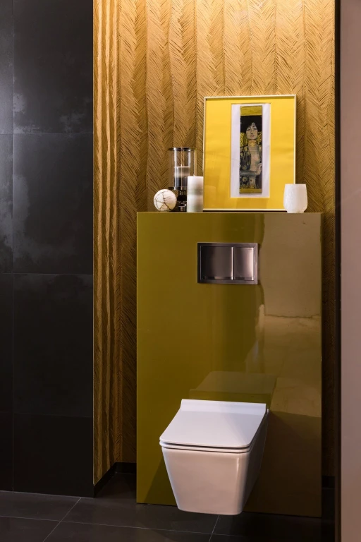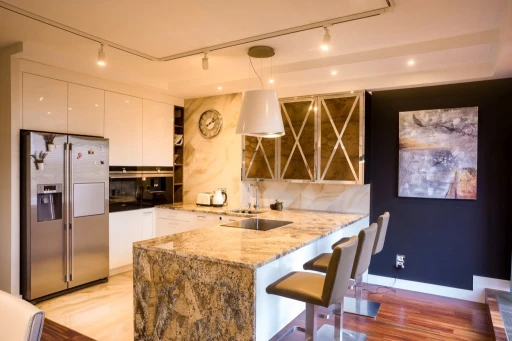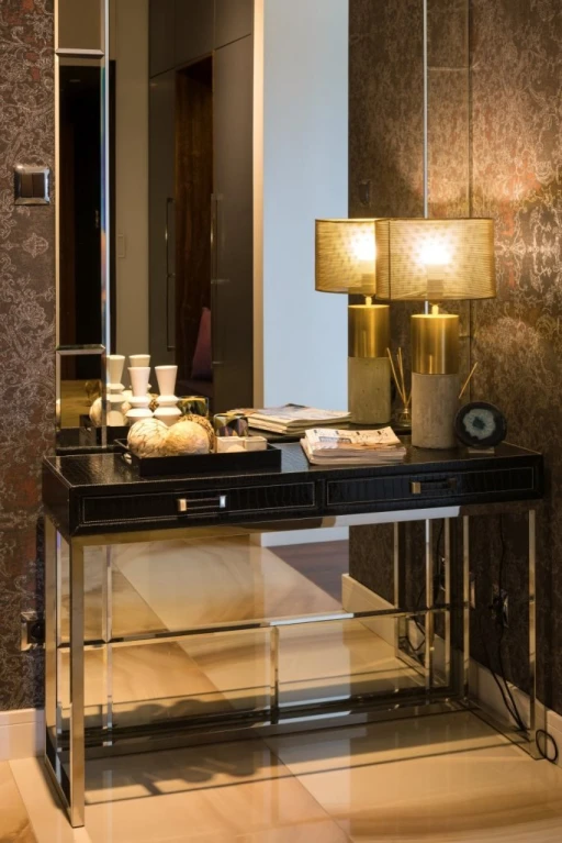 Inwestorom bardzo podobał się styl nowoczesny, a architekci postanowili dodać do niego akcenty glamour i nowojorskie. Proste, minimalistyczne formy i wyważone materiały wykończeniowe, dominujące w całym apartamencie, zostały przełamane bardziej wyrazistymi elementami nawiązującymi do tych nurtów. W prostej, białej zabudowie kuchennej wykonanej przez stolarza pojawiły się szafki z dekoracyjnym fornirem zdobionym chromowanymi listwami. Z kolei w hallu obok ciekawej szafy z ławeczką, na której można przysiąść, zakładając buty, na tle tapety w charakterystyczny wzór, ustawiono konsolę na błyszczącej, geometrycznej konstrukcji. W sypialni zastosowano podobne kontrasty. Kultowe lampy Artemide z rodziny Tolomeo (do nabycia w Dekorianie), elegancką i spokojną tapetę w pasy marki Omexco (również z portfolio ogólnopolskiej sieci) zestawiono z efektownym żyrandolem, stolikami nocnymi o charakterystycznych nowojorskich kształtach oraz tkaninami imitującymi futro.