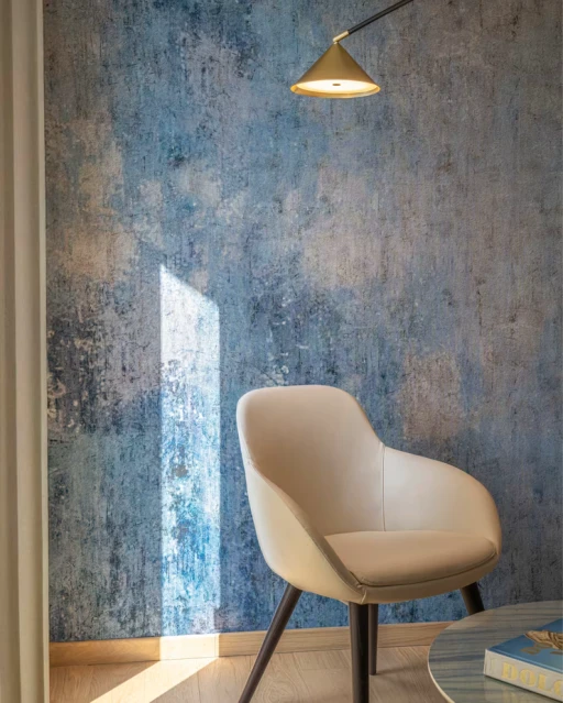 Wewnątrz delikatne tony rozwijają się na miękkich tkaninach i wykończeniach o wyczuwalnej fakturze, tworząc stonowaną, ciepłą atmosferę. Tapety o akwarelowym efekcie budują wielowarstwowe gry przezroczystości, które wzmacniają poczucie głębi we wnętrzach.