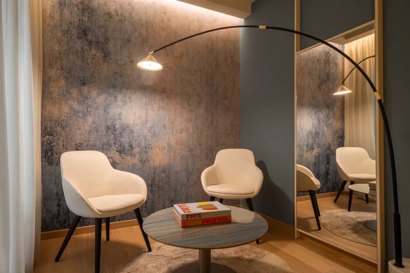 W pokojach szczególnie wyróżnia się tapeta Indigo; dzięki swoim błękitnym tonom przywodzi na myśl refleksy Jeziora Garda i towarzyszy gościom w zanurzeniu się w kojącej, jeziornej atmosferze. Paleta kolorów współgra z wyposażeniem i materiałami o miękkim, świetlistym charakterze, kształtując przestrzenie, które odzwierciedlają spokój otaczających wód.