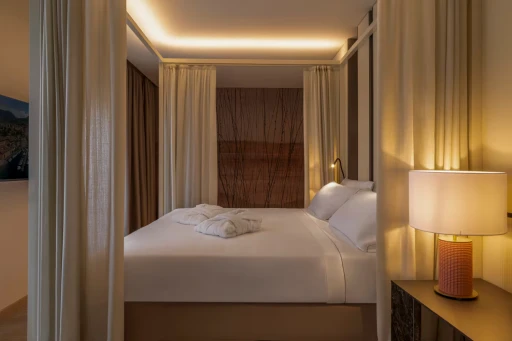 Szczególnie efektowna jest aranżacja w Suite Perla, ekskluzywnym pokoju od strony jeziora z zapierającym dech w piersiach widokiem, gdzie subtelność tapety współgra ze światłem dziennym, zamieniając pobyt w doświadczenie kontemplacji.