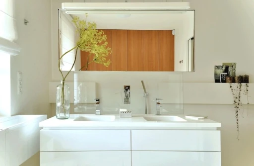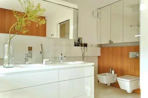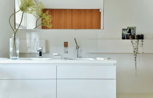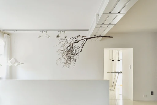 Pierwotnie układ domu nie był zbyt atrakcyjny, dlatego architekt - Sylwia Liana z pracowni projekti, zdecydowała się na radykalne kroki w postaci wyburzeń. Ślad po największej ingerencji w pierwotny plan domu, stanowią metalowe belki przebiegające przez salon. Dzięki usunięciu ścian udało się uzyskać wygodną, przestronną przestrzeń. Biel, przeszklenia i proste geometryczne podziały potęgują to wrażenie. Podobnie jak zastąpienie klasycznych drzwi przesuwnymi, chowanymi w ścianach.