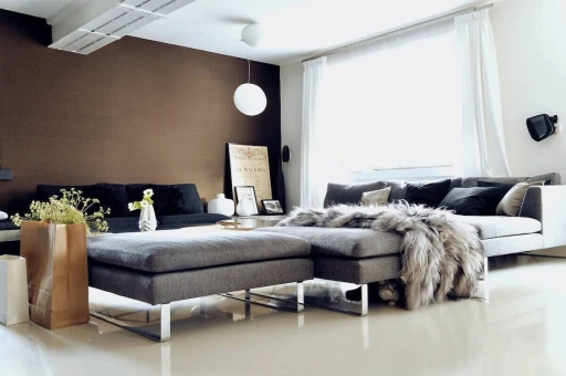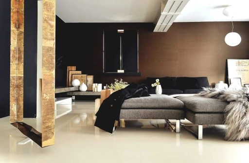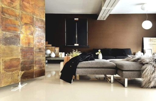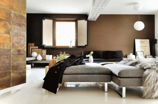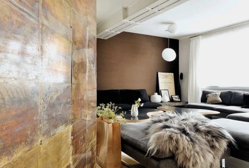 Ciekawy zabieg, który nadał dynamiki przestrzeni został zastosowany w salonie. W pozornie nieodpowiednim miejscu zainstalowano obrotowe lustro obłożone mosiężną blachą. Nie jest ono jedynie dekoracją, ale też nieinwazyjną ścianką działową. Przysłania wejście do WC od strony salonu i pozwala dyskretnie kierować ruchem gości - odpowiednio ustawiając lustro, można zaprosić ich albo w stronę salonu albo jadalni.