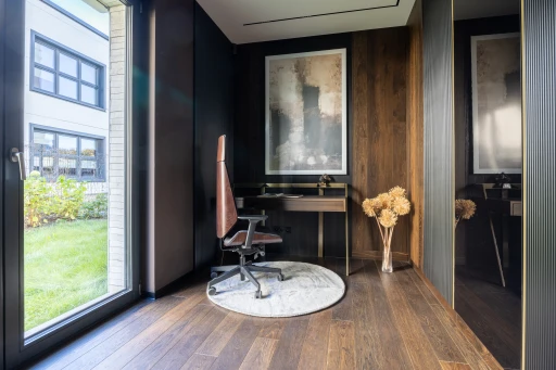 Już od progu widać dążenie do harmonii i ponadczasowej estetyki. Jasne beże, kremy i ciepłe drewno przeplatają się z ciemnymi elementami, nadając przestrzeni rytm i głębię. To wnętrze nie epatuje przepychem – jego siła tkwi w spokoju i konsekwencji.