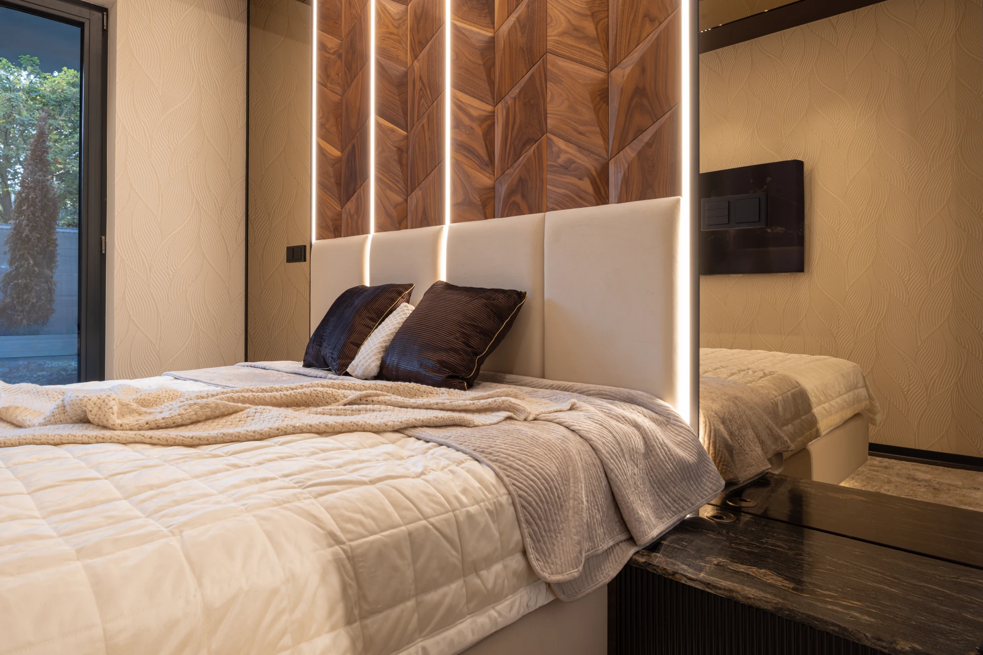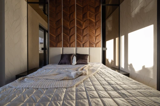 Sypialnia to najbardziej prywatna część apartamentu – pełna miękkich tkanin, światła i detalu. Za wezgłowiem łóżka znajduje się spektakularna ściana z drewnianych paneli 3D marki Nobifloor w układzie Smooth Sun, zamówionych w Dekorian Home. Rysunek drewna układa się w geometryczny rytm, który ociepla przestrzeń i wydobywa jej naturalny charakter.
