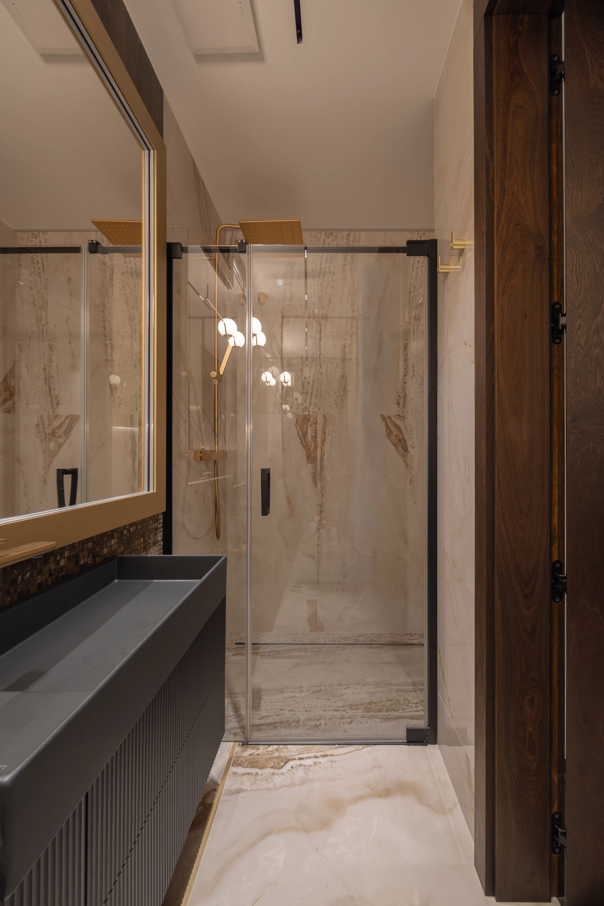 Łazienka została zaprojektowana jako przestrzeń relaksu – dominują w niej jasne płyty inspirowane kamieniem, drewno i ciepłe światło. Geometryczny układ płytek, minimalistyczna armatura i dyskretne oświetlenie podkreślają czystość formy. Wszystko jest przemyślane, ale nie przesadzone – estetyka idzie tu w parze z funkcjonalnością.
