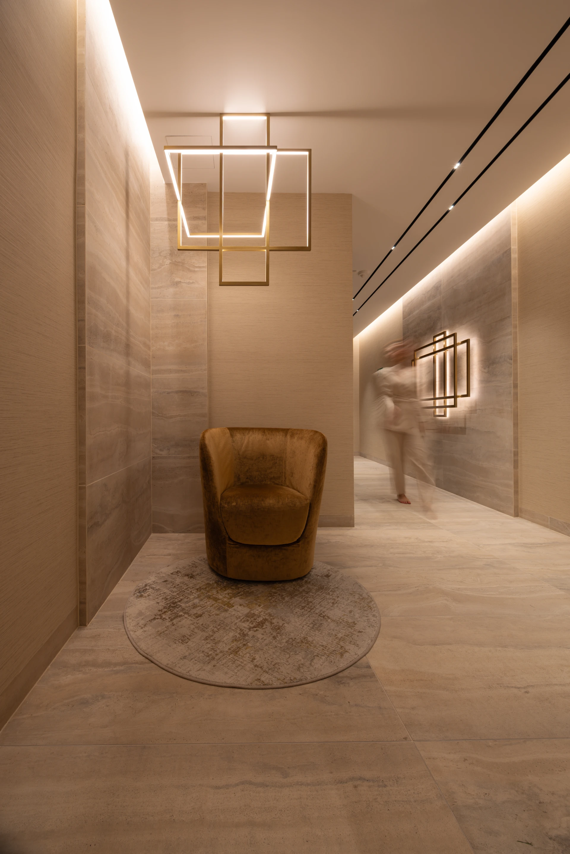 W korytarzu wzrok przyciąga biało-złota tapeta OMEXCO Khatam (również z Dekorian Home), która tworzy eleganckie tło dla lustrzanych tafli, oświetlenia liniowego i minimalistycznych drzwi. To detal, który łączy części prywatne i dzienne apartamentu w spójną całość.