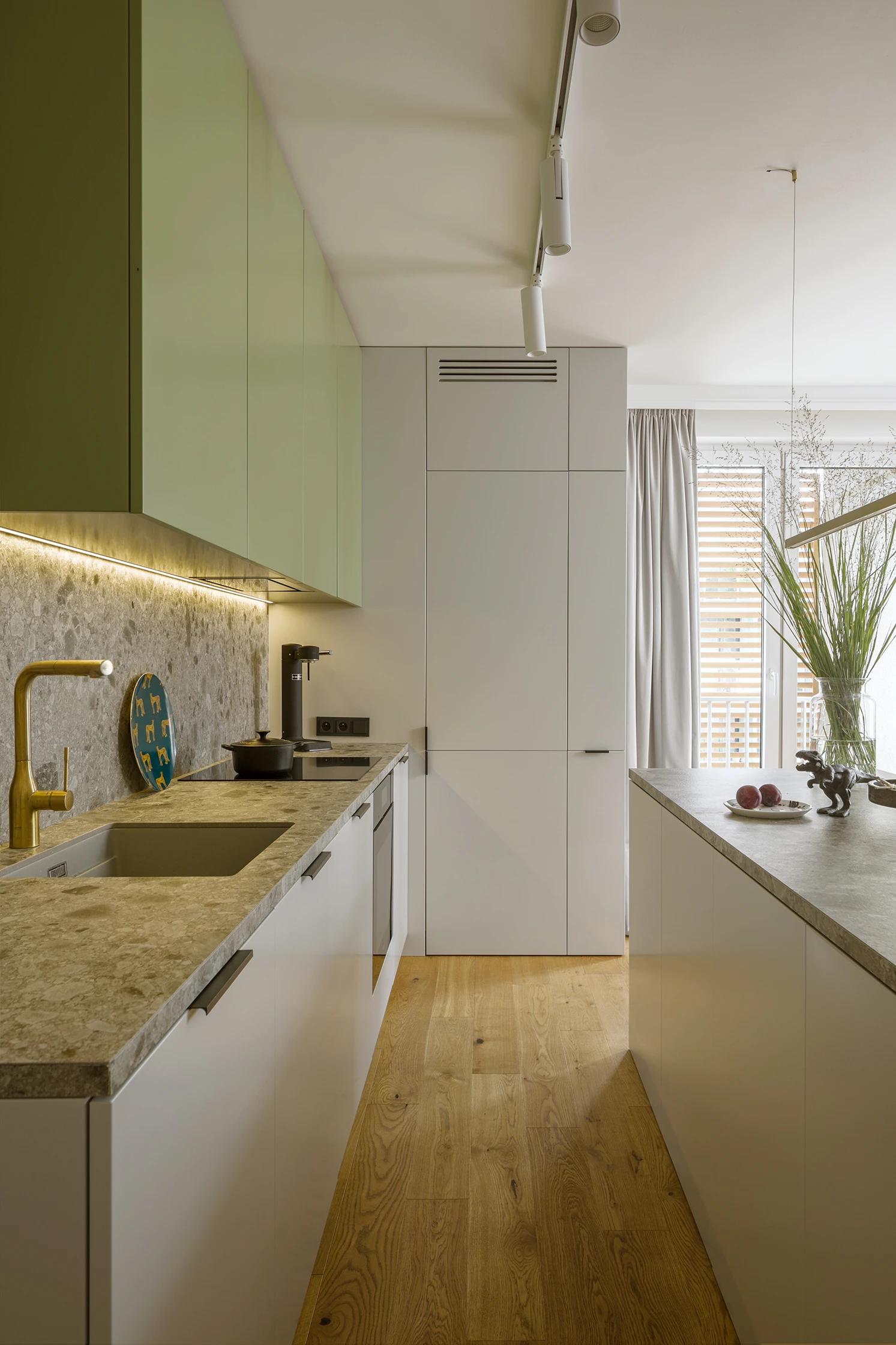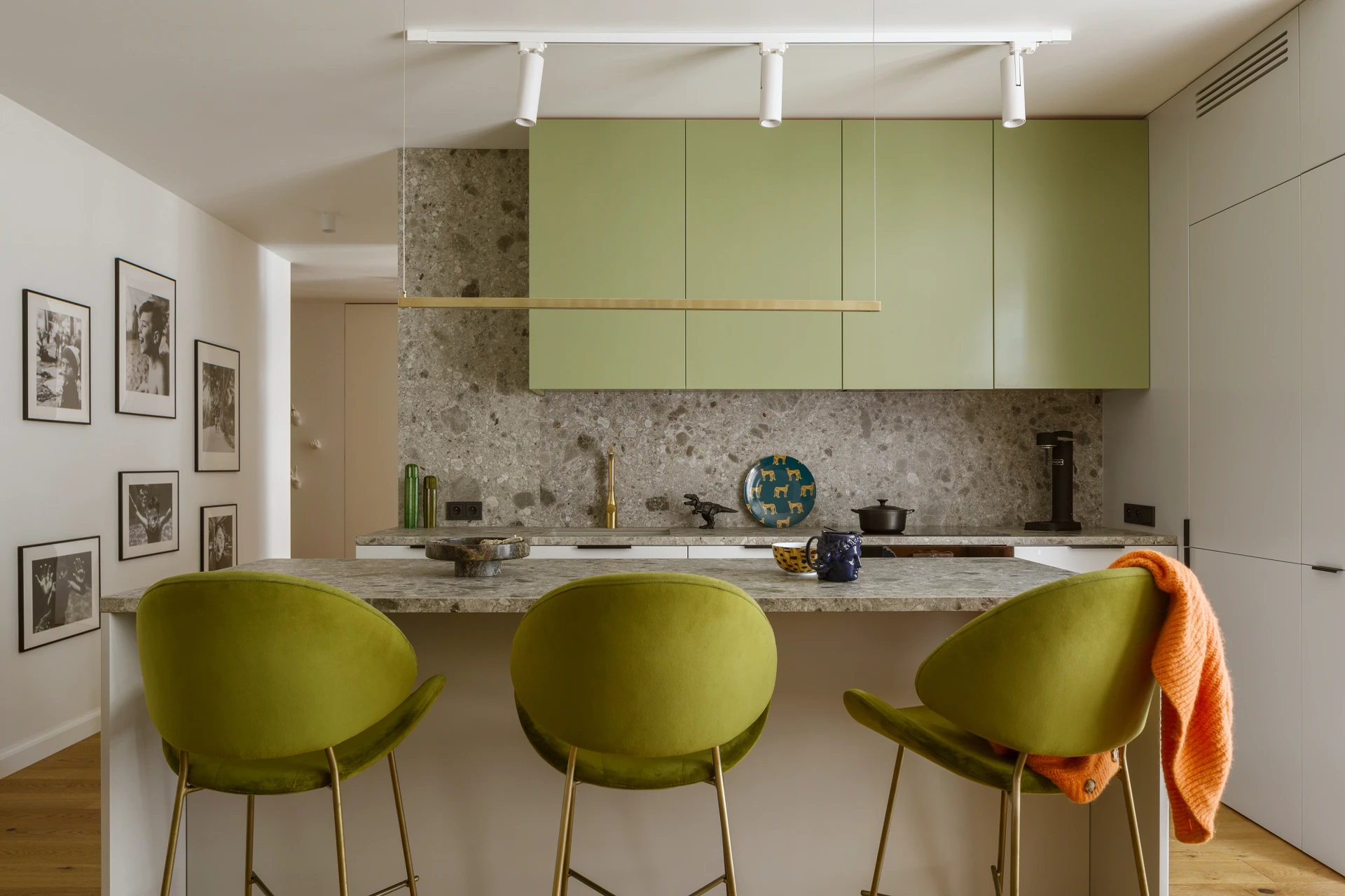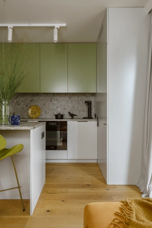 Ta kolorystyczna odwaga nie jest jednak chaotyczna. Każdy ton ma tu swoje miejsce i uzasadnienie. Oliwkowa kuchnia została zestawiona z jasną szarością i lastryko, co łagodzi intensywność barw, a jednocześnie podkreśla ich świeżość. Subtelne detale – jak czarno-biały osprzęt Gira, harmonizujący z kolorystyką ścian i frontów - dodają kompozycji wyważonej elegancji. To właśnie takie drobiazgi budują spójność projektu, sprawiając, że wnętrze jest zarówno pełne energii, jak i wizualnie uporządkowane.
