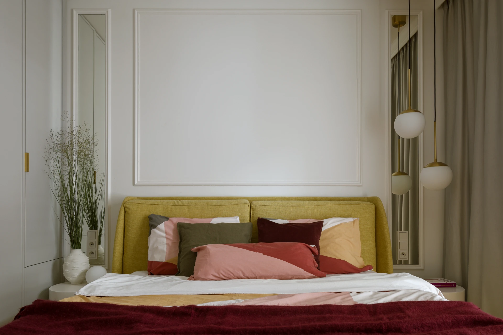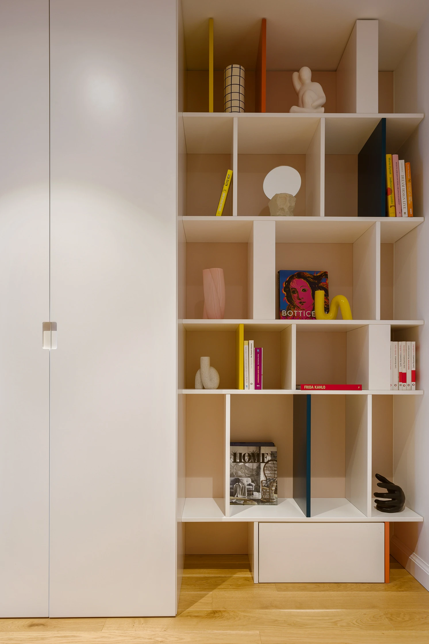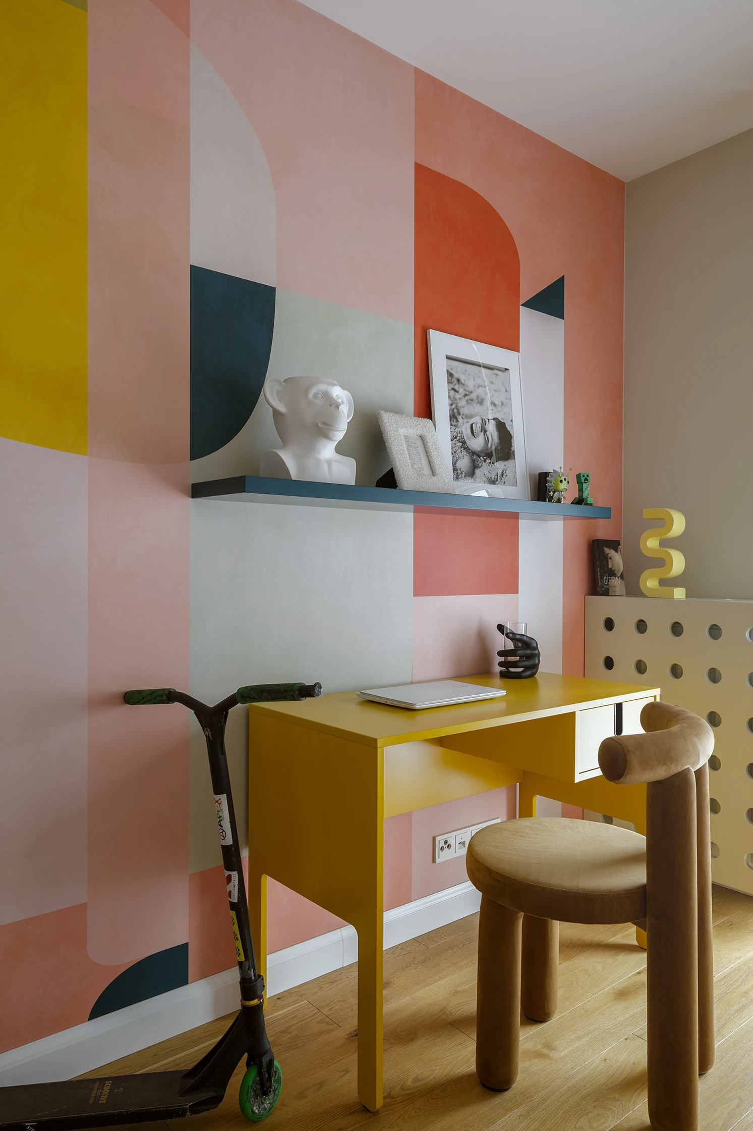 W drugim pokoju powstał domowy gabinet - miejsce do pracy i twórczych zajęć. Tutaj kolorystyka przybiera bardziej na sile prezentując geometryczne, pastelowe kształty bliskie stylowi Memphis. Kontrastująca, stonowana zabudowa koi wzrok, a różowe akcenty w dodatkach dodają subtelnego, kobiecego tonu. Pomimo niewielkiego metrażu, udało się zachować poczucie przestronności dzięki jasnym powierzchniom i lekkim meblom o ażurowej formie. Sypialnia to najbardziej intymna część mieszkania - spokojna, ale niepozbawiona charakteru. Odcienie beżu i różu tworzą ciepły kokon, który sprzyja odpoczynkowi. Wzrok przyciągają detale: złote uchwyty, delikatne oświetlenie punktowe i kolejny, tym razem ręcznie malowany motyw na ścianie.