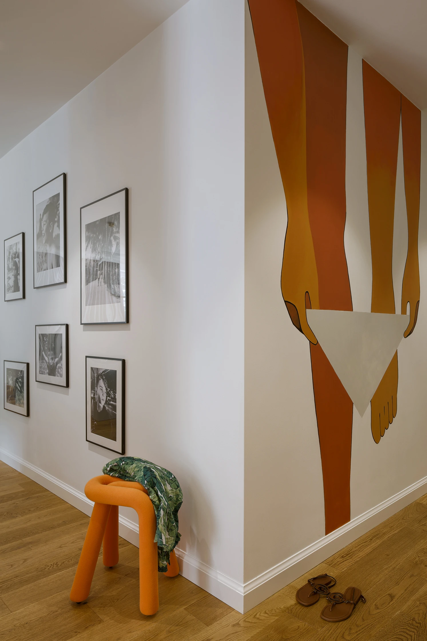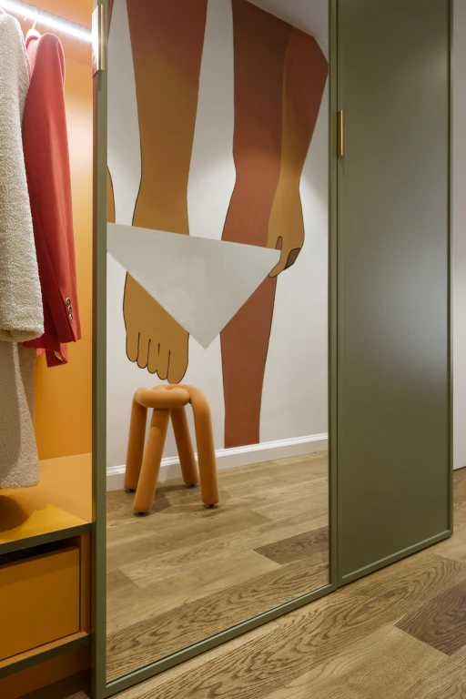 - W Polsce mamy zbyt wiele dni pozbawionych słońca, dlatego chciałam, żeby kolory dodawały mi energii - mówi inwestorka. Architektka z Tilla Architects postawiła więc na odważną paletę barw: pomarańcz, róż i zieleń, przełamaną złamaną bielą i szarością lastryko. Już od progu uwagę przykuwa mural w strefie wejściowej - abstrakcyjny, pełen życia i ruchu, stanowiący zapowiedź dalszej opowieści o wnętrzu.