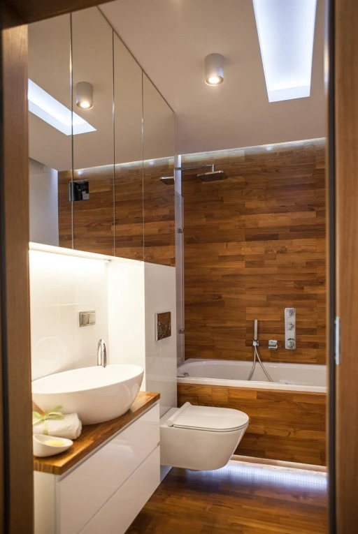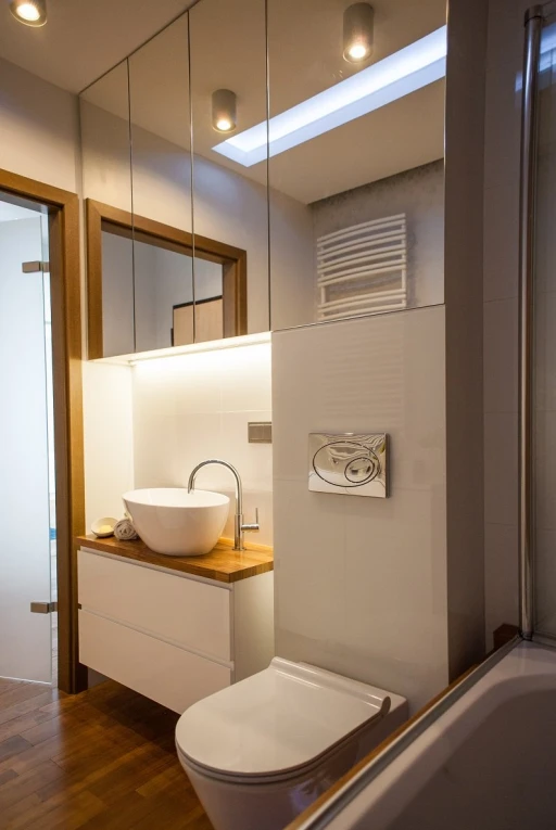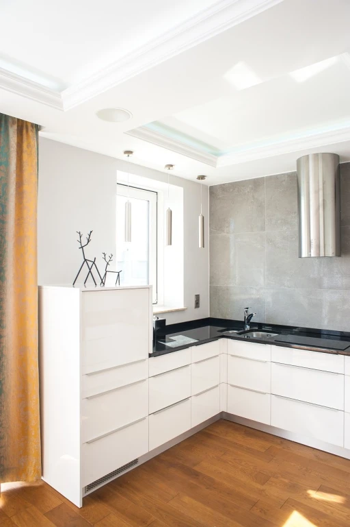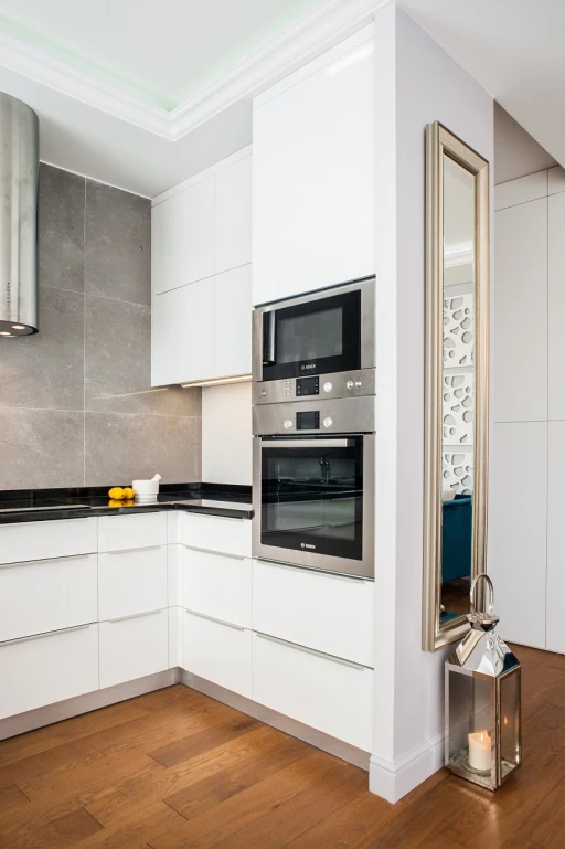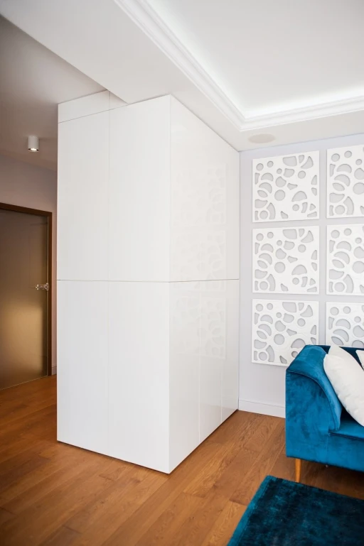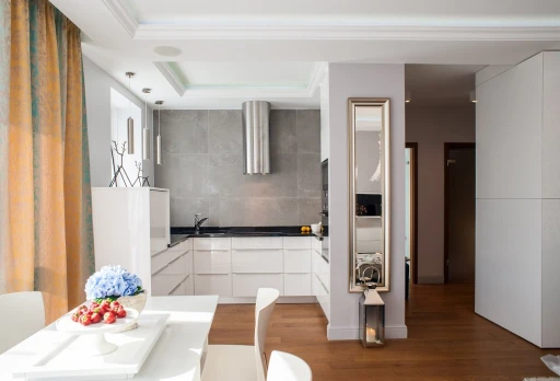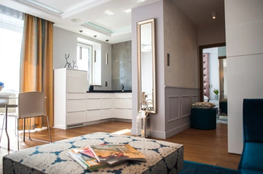 Ze względu na usługowy charakter apartamentu architekt postawił na wysokiej jakości materiały wykończeniowe, które nie tylko będą dekorować przestrzeń, ale również sprostają intensywnemu użytkowaniu. Subtelne tło dla aranżacji stanowią szarości i biele z palety Para Paints. Podłoga w salonie i przedpokoju wykończona jest deską dębową Nobifloor, a w sypialni miękką puszystą wykładziną Epic Carpets. Atmosfery starej francuskiej kamienicy dodają klasyczne sztukaterie marki NMC. W łazience króluje drewno tekowe i lustra. W korytarzu zwraca uwagę tapeta Marburg z kolekcji Pure.