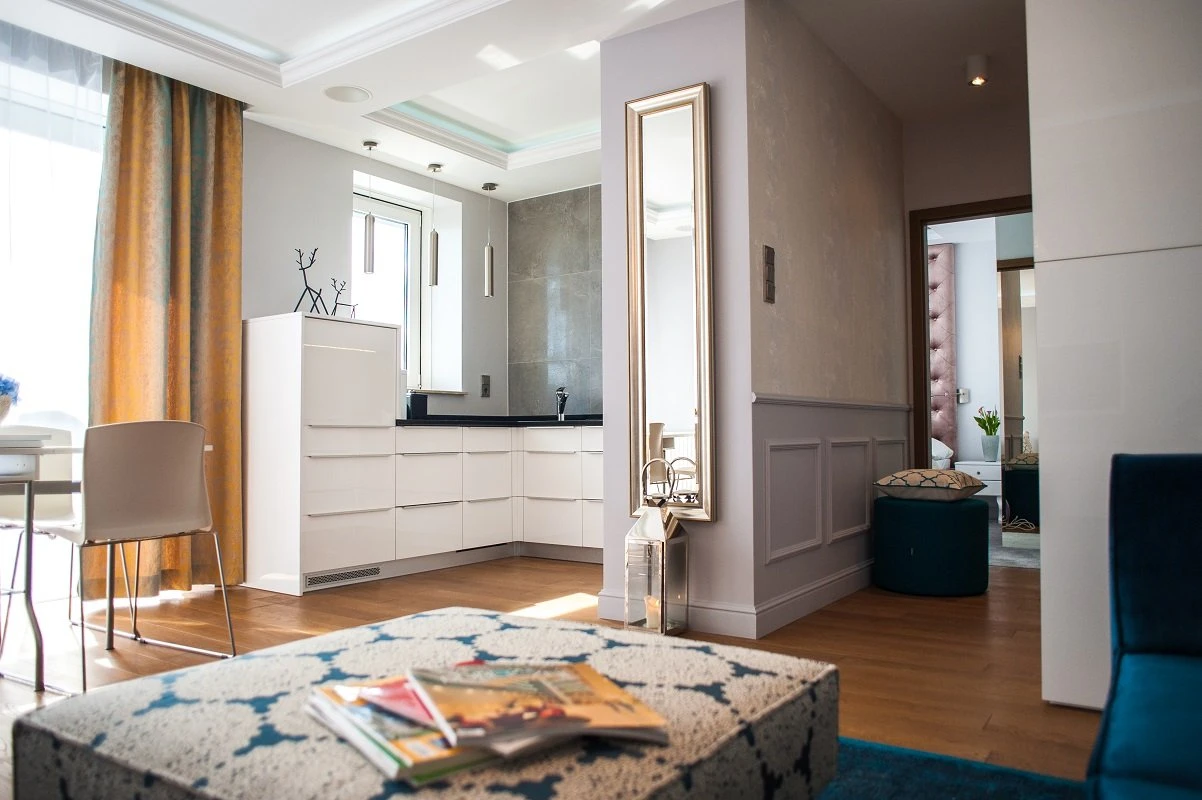 Klimatyczny apartament zlokalizowany jest na dziewiątym piętrze w jednym z gdańskich wieżowców. Jest on wynajmowany turystom z całego świata, którzy swój pobyt w Trójmieście, zamiast w sztampowym pokoju hotelowym, wolą spędzić w butikowym wnętrzu z duszą. Projektantem apartamentu jest Arkadiusz Grzędzicki. Na stosunkowo skromnej powierzchni 46 m² znajduje się salon z częścią jadalnianą i otwartą kuchnią, sypialnia, łazienka oraz przedpokój. Do lokalu przynależy również duży taras z pięknym widokiem na miasto i morze. Projektant miał stworzyć wysmakowane wnętrze w francuskim klimacie, które będzie z jednej strony eleganckie, z drugiej zaś przyciągnie uwagę dekoracyjnym detalem i kolorystyką oraz przytulnym charakterem. Bardzo istotna była również sfera funkcjonalna, stąd duża liczba szaf, w pełni wyposażona kuchnia czy wanna z hydromasażem. W sferze estetycznej zwraca uwagę różnorodność materiałów, faktur i kolorów. Wykończonym na wysoki połysk frontom kuchennym towarzyszą koronki, zamszowe tapicerowane meble oraz fantazyjne panele ścienne w salonie. Mocnym akcentem kolorystycznym są turkusowa kanapa, fotel, puf i dywan, ale nie mniejsze wrażenie robi pikowane, bladoróżowe wezgłowie łóżka, sięgające do samego sufitu.