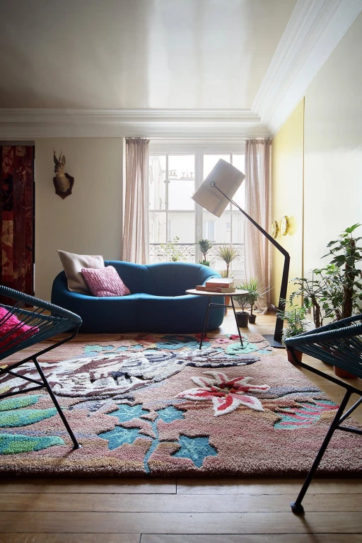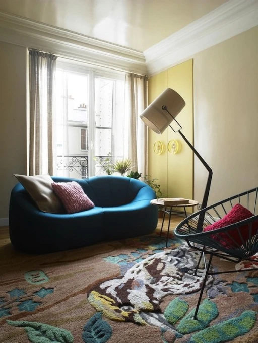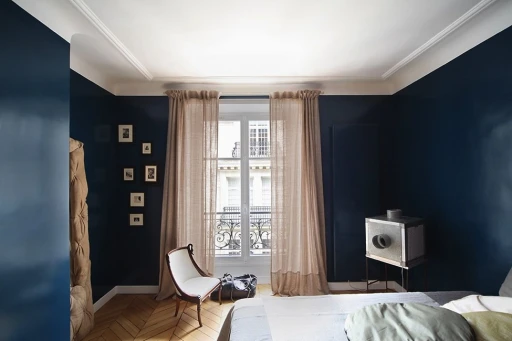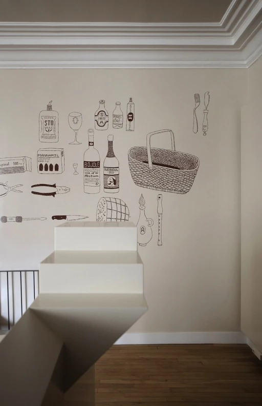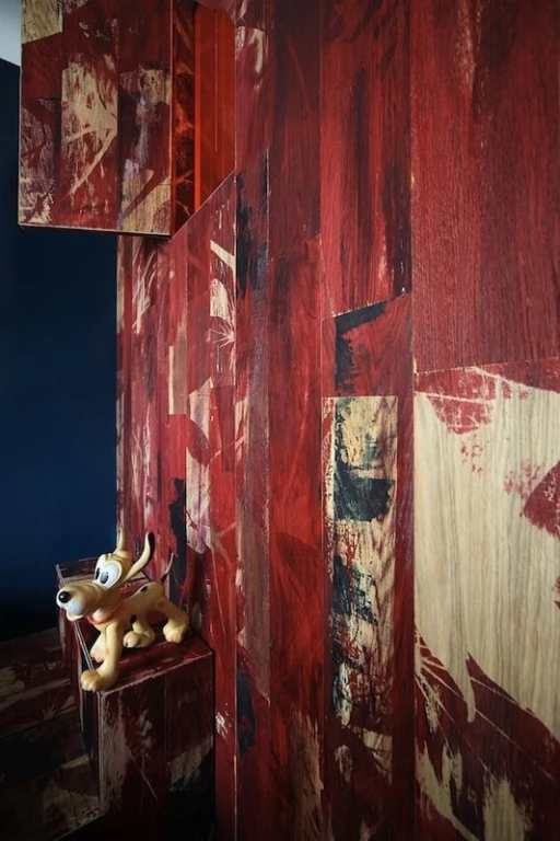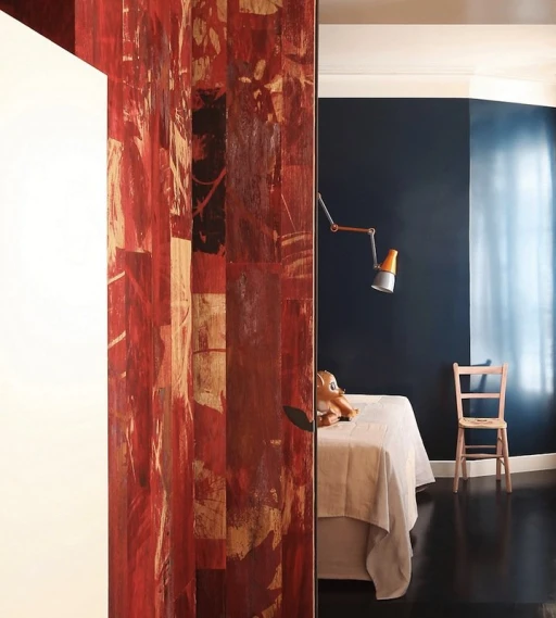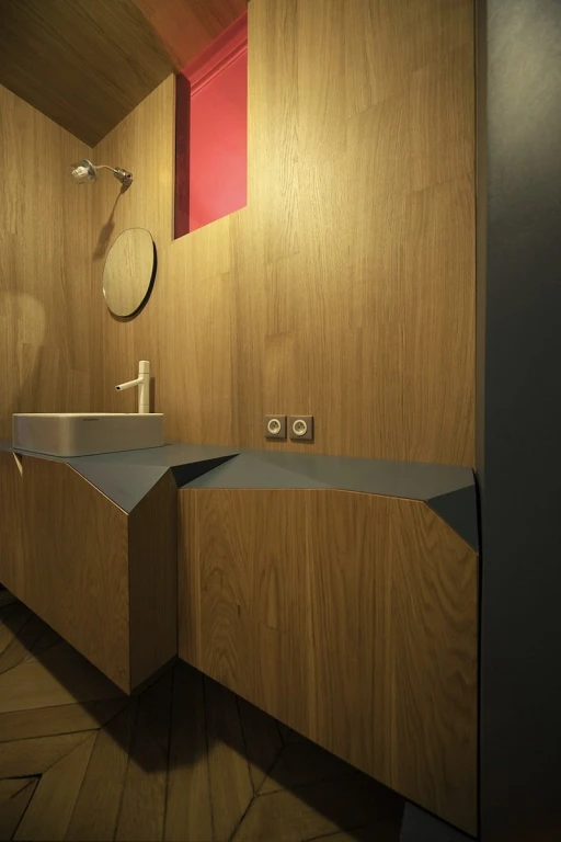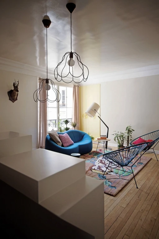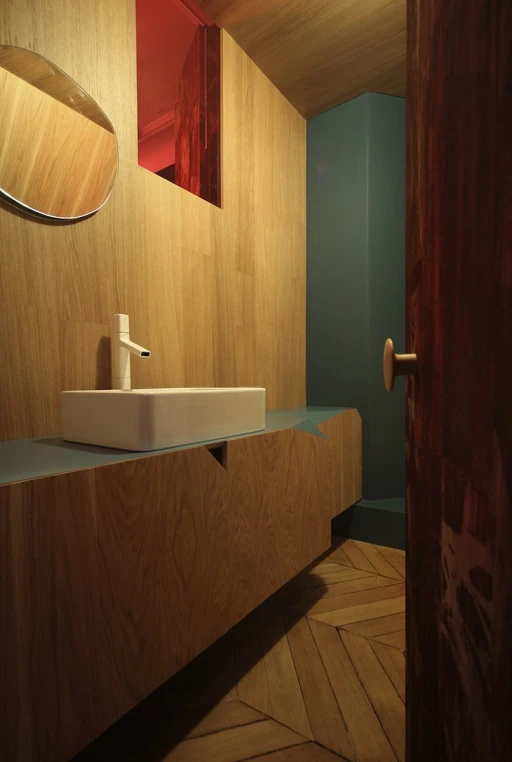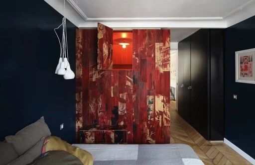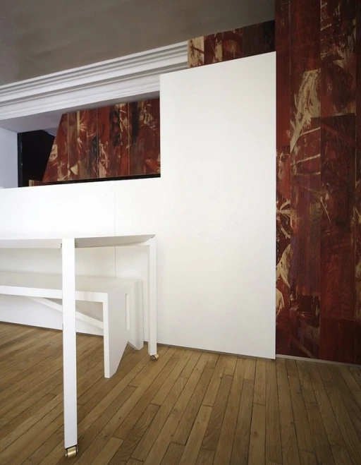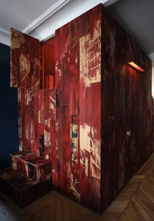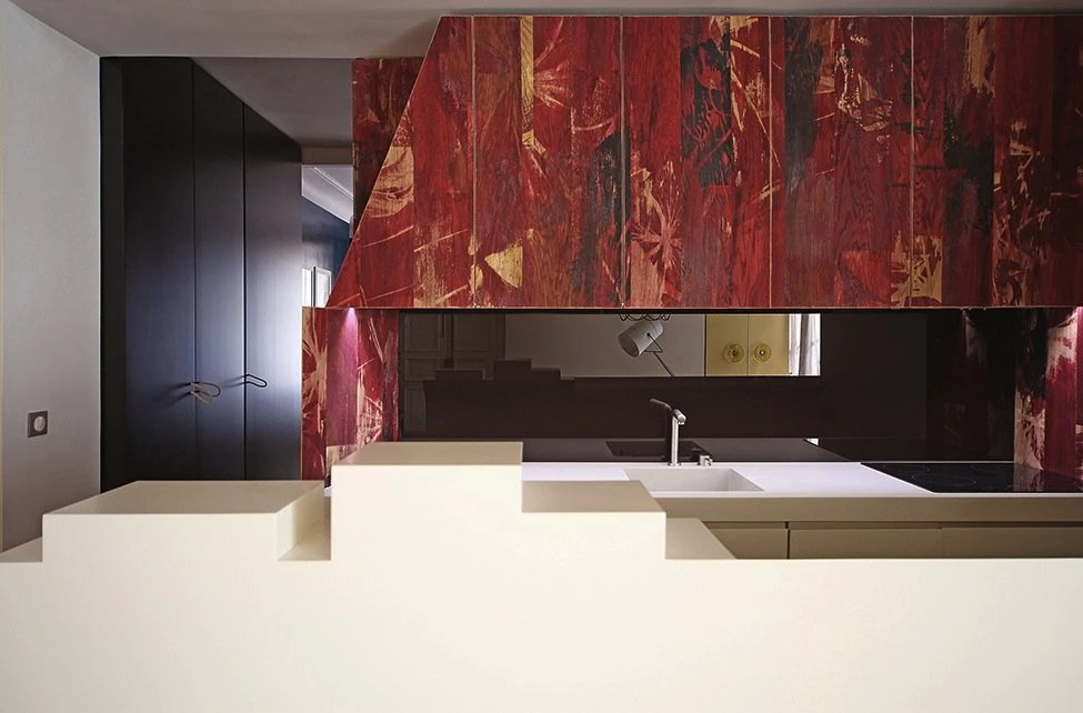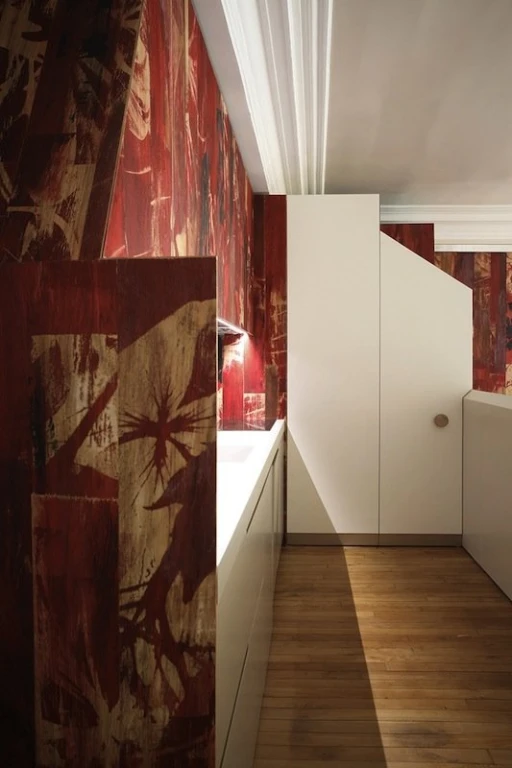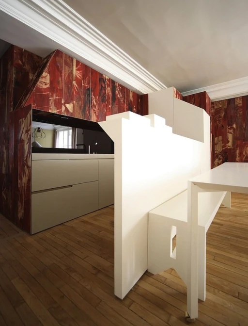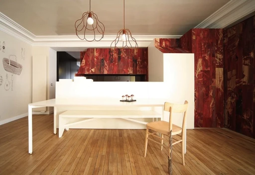 Otwarty plan mieszkania łączy centralnie usytuowany zespół kuchenno-łazienkowy obłożony drewnianymi panelami w kolorze czerwieni. Został on wykonany we Włoszech i przetransportowany do Paryża – co miało uzasadnienie praktyczne i ekonomiczne. Kuchnia została zaprojektowana tak, aby zorganizować na nowo życie mieszkańców, a sypialnia, by tworzyć nastrój intymności. Całość jest bardzo odważna i dynamiczna. Nie pozwala na obojętność.