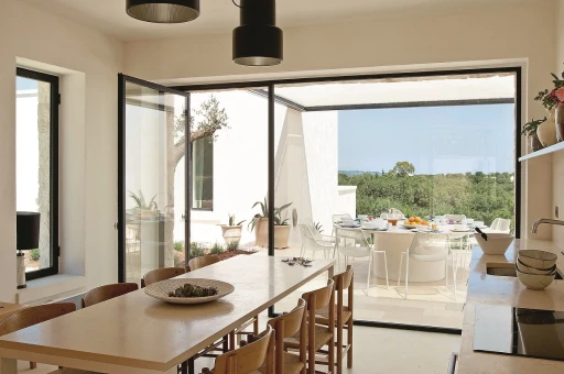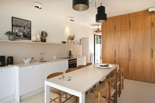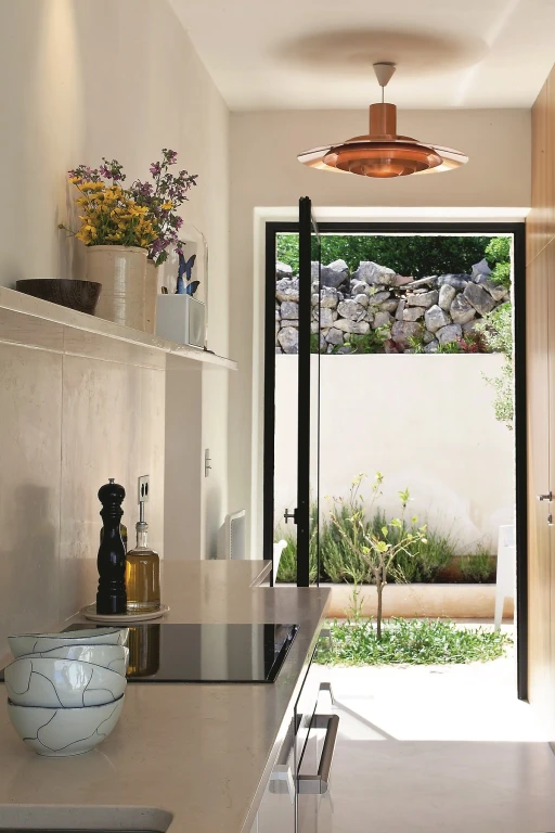 Dzięki otwarciu kuchni i jadalni na ogród gospodarze mają nie tylko piękny widok, ale też mogą się tu poczuć jak na wakacjach. Wdzierająca się do wnętrza zieleń, zapach ziół i śpiew ptaków pozwalają się w pełni zrelaksować. Większość mebli jest tu autorstwa Fabrica Bejjaniego. Od razu widać zamiłowanie projektanta do vintage – lat pięćdziesiątych i sześćdziesiątych. Pozostałe zostały zakupione na targach staroci w różnych miejscach świata, odnowione i przywiezione tu, aby dodały charakteru całości.