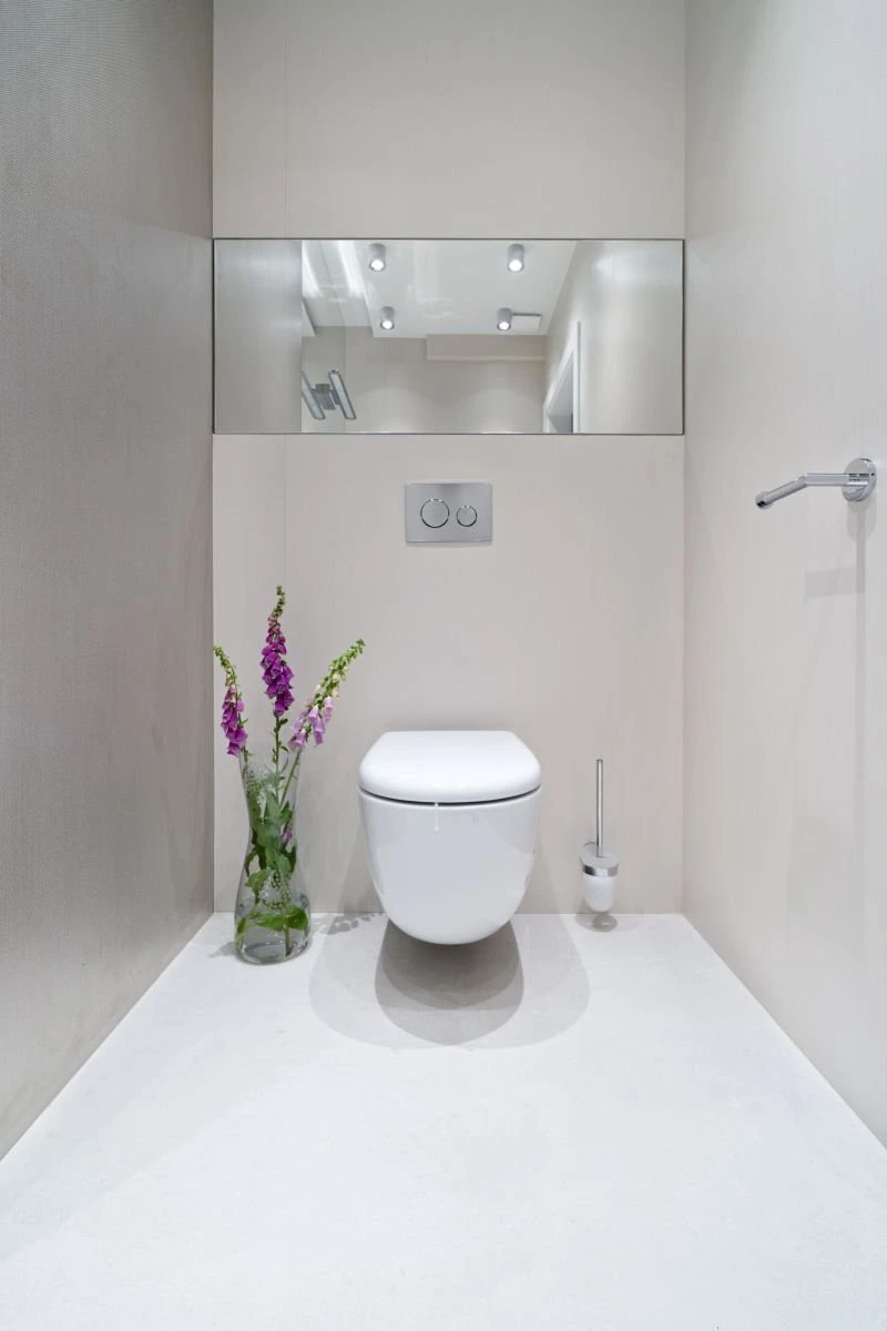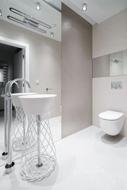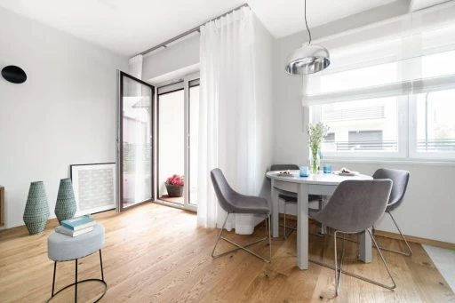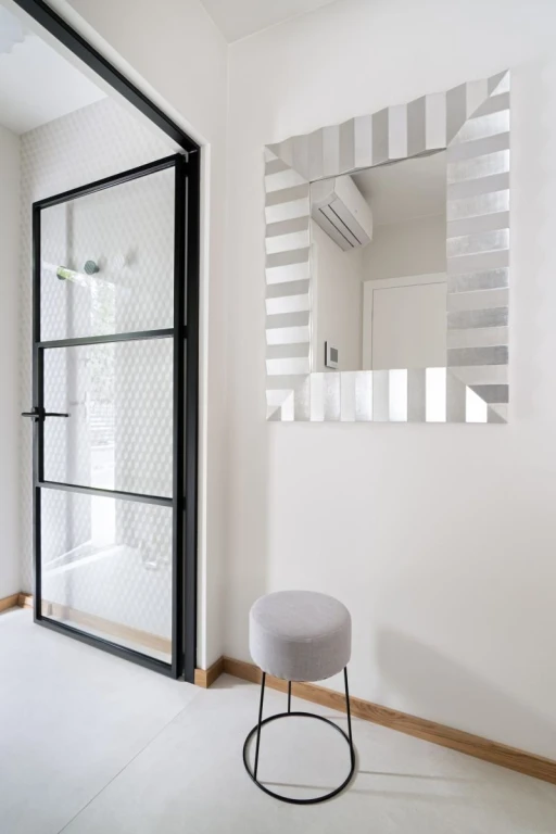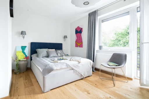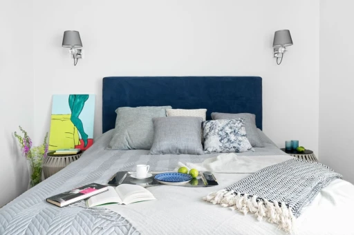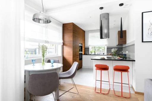 Apartament ma okna wychodzące na wschód i południe, co sprawia, że jest w nim dosyć ciemno. Chcąc nieco rozświetlić wnętrze projektanci zdecydowali się na spokojną, stonowaną paletę barw, w której dominantami są gołębia szarość i ciepła biel. Wprowadzone przez nich powierzchnie odbijające światło dodatkowo wzmacniają ten efekt. Energia i witalność, które charakteryzują panią domu, pojawiają się za sprawą mocniejszych kolorów. Koralowe hokery w kuchni, barwne tekstylia czy granatowe wezgłowie łóżka wprowadzają nieco wibracji do spokojnego i monochromatycznego wnętrza.