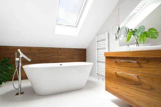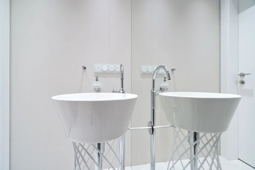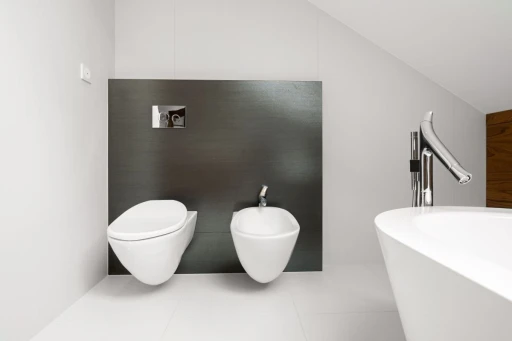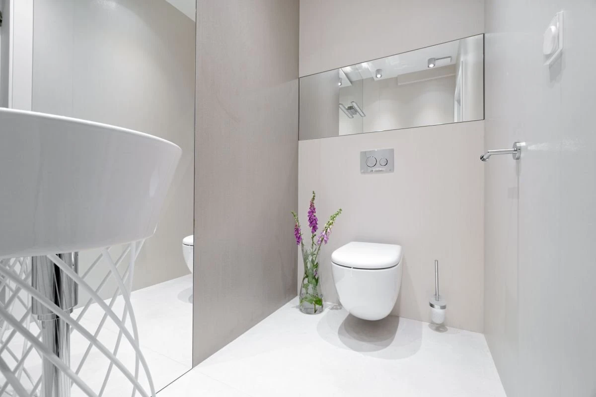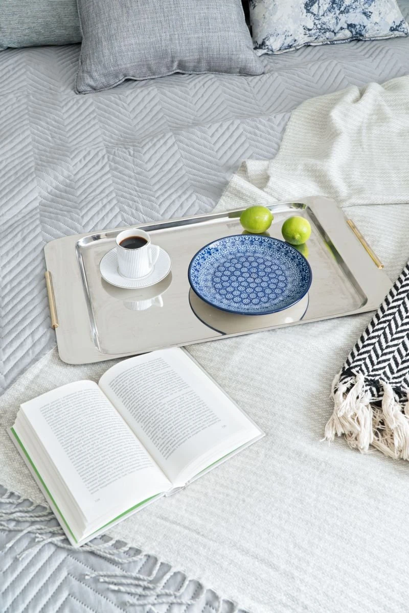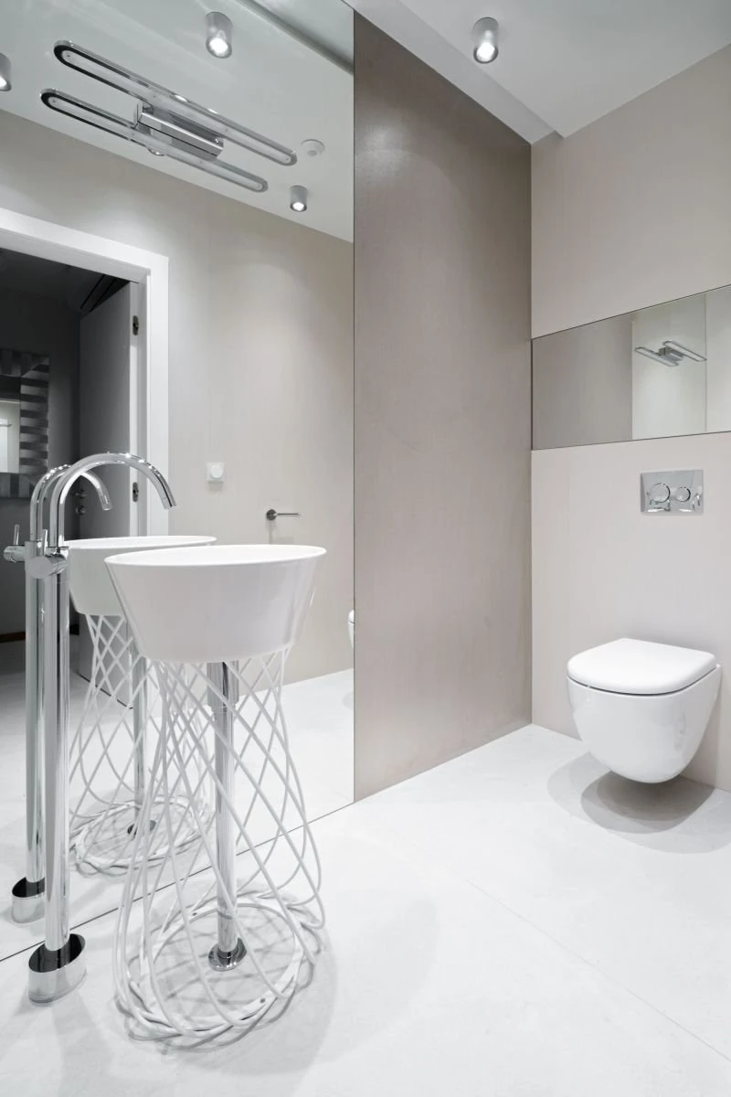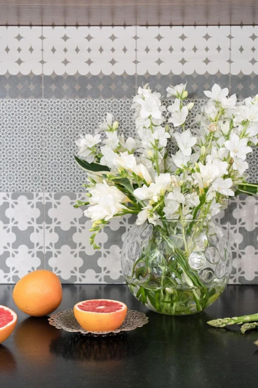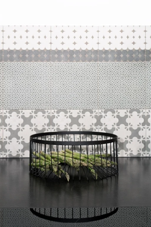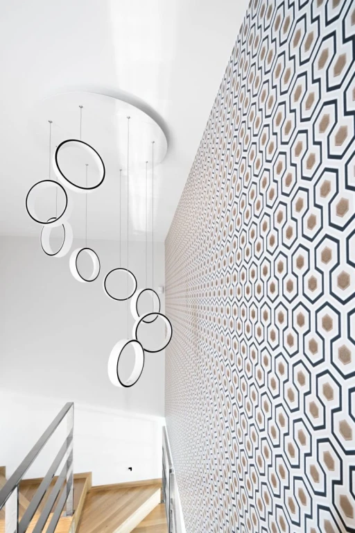 Do pomalowania ścian architekci wykorzystali wysokiej jakości ceramiczne farby kanadyjskiej marki Para Paints (dystrybuowane przez Dekorian). Ciekawym urozmaiceniem dla gładkich, jednobarwnych powierzchni stały się luksusowe tapety. W hallu zastosowano dyskretną okładzinę marki Khroma, na klatce schodowej na piętrze Art Decowski motyw z kolekcji Contemporary Restyled od Cole&Son (również z portfolio ogólnopolskiej sieci). Obie łączy geometryczny wzór, świetnie współgrający z szaro-białymi kaflami Mutiny zaprojektowanymi przez Patricię Urquiolę, którymi zabezpieczono newralgiczne miejsca nad blatem kuchennym. Podłogi tarnowskiego apartamentu wykonano z najwyższej klasy dębowego drewna, a zabudowy z orzechowego forniru. Dzieło lokalnego stolarza świetnie prezentuje się w towarzystwie minimalistycznych spieków kwarcowych Laminam z serii Filo, które położono w łazience. Niezwykle szykownym i efektownym elementem są również powierzchnie z polerowanej stali i chromu. Lampa nad stołem w jadalni, okap kuchenny, barierka schodów, lustro w hallu, lampka w gabinecie, stoliki kawowe, organiczne kształty armatury Hans Grohe stanowią fantastyczną wnętrzarską biżuterię.