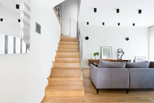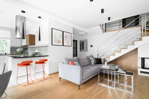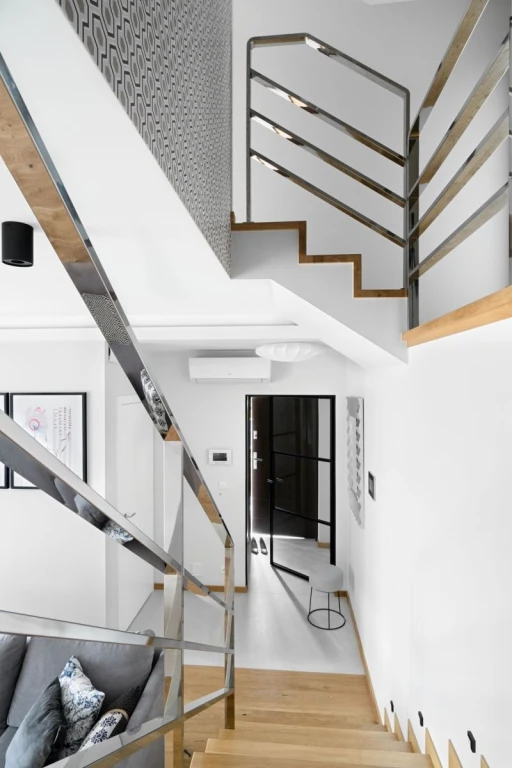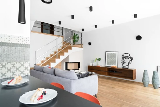 Dwukondygnacyjny apartament o powierzchni ponad 100 metrów kwadratowych mieści się w wielorodzinnym budynku w prestiżowej, usytuowanej u podnóża ruin średniowiecznego zamku, willowej dzielnicy Tarnowa. Na parterze domu znajduje się strefa dzienna: salon połączony z jadalnią i otwartą kuchnią oraz toaleta. Otwarta klatka schodowa wiedzie na piętro, na którym, po wyburzeniu niektórych ścian, wygospodarowano część prywatną - sypialnię, garderobę i gabinet oraz gościnną, ze wspólną dla nich obu łazienką.