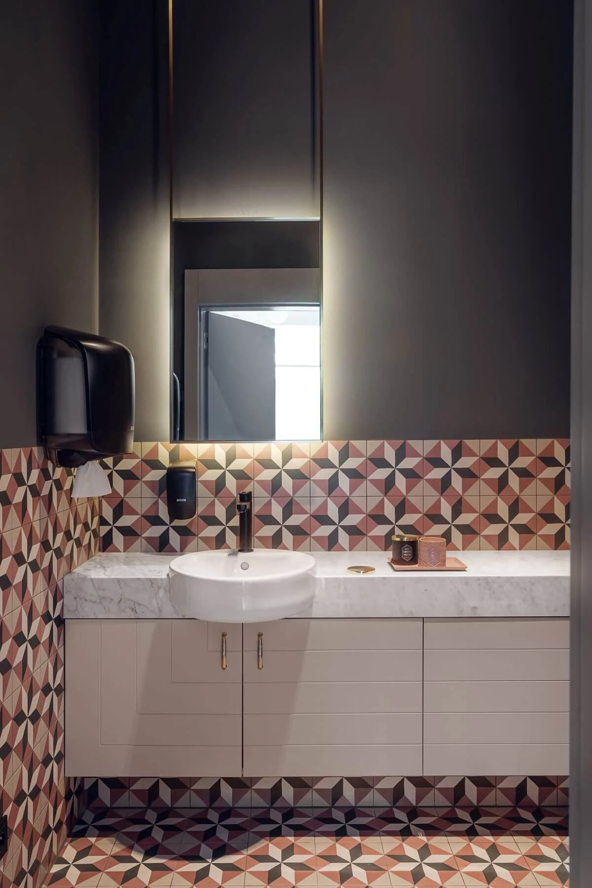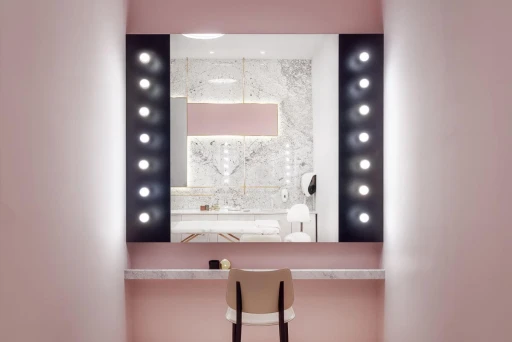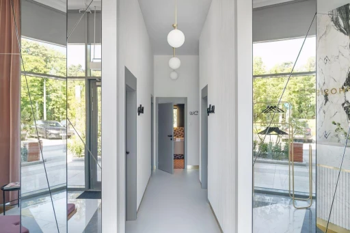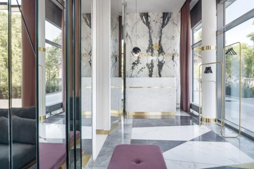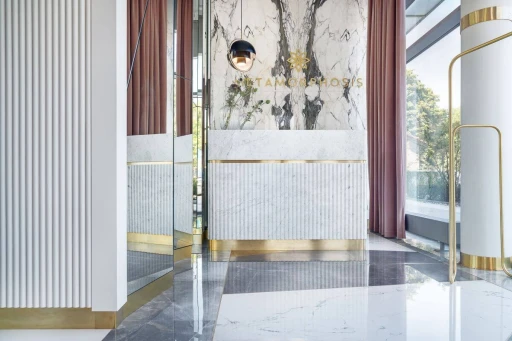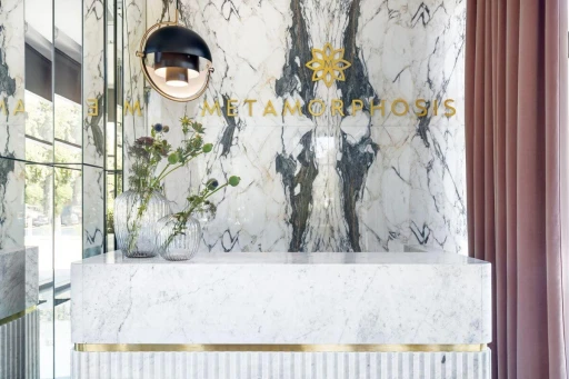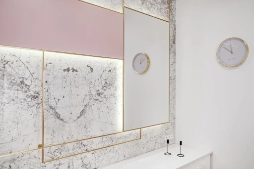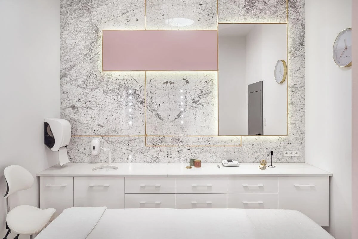 Koncepcja została oparta na marmurze, który ma symbolizować trwałość i jakość zabiegów oferowanych przez pracujących tu ekspertów. Na ścianie w recepcji zastosowano marmur carrara arabescato, na wyspie z kolei bianco carrara, podobnie jak na ścianach w gabinetach. Z tego szlachetnego kruszcu jest również wyspa w recepcji oświetlona lampą GUBI. Projektanci zainspirowali się także mosiądzem - we wnętrzu w oczy rzucają się złote detale w postaci logotypu, cokołów czy elementów konstrukcyjnych mebli. Oba materiały zostały przełamane pastelowym różem, kolorem niezwykle kobiecym i delikatnym, a jednocześnie bardzo modnym. W wysokich oknach zawisły ciężkie, welurowe zasłony w kolorze brudnego różu, przełamujące chłód pomieszczeń. 4,5 m wysokość lokalu podkreślono oryginalnymi lustrami pokrywającymi całe ściany w recepcji i poczekalni. Odbija się w nich geometryczny wzór na podłodze, tworząc wyjątkową grę oryginalnych elementów ze światłem.