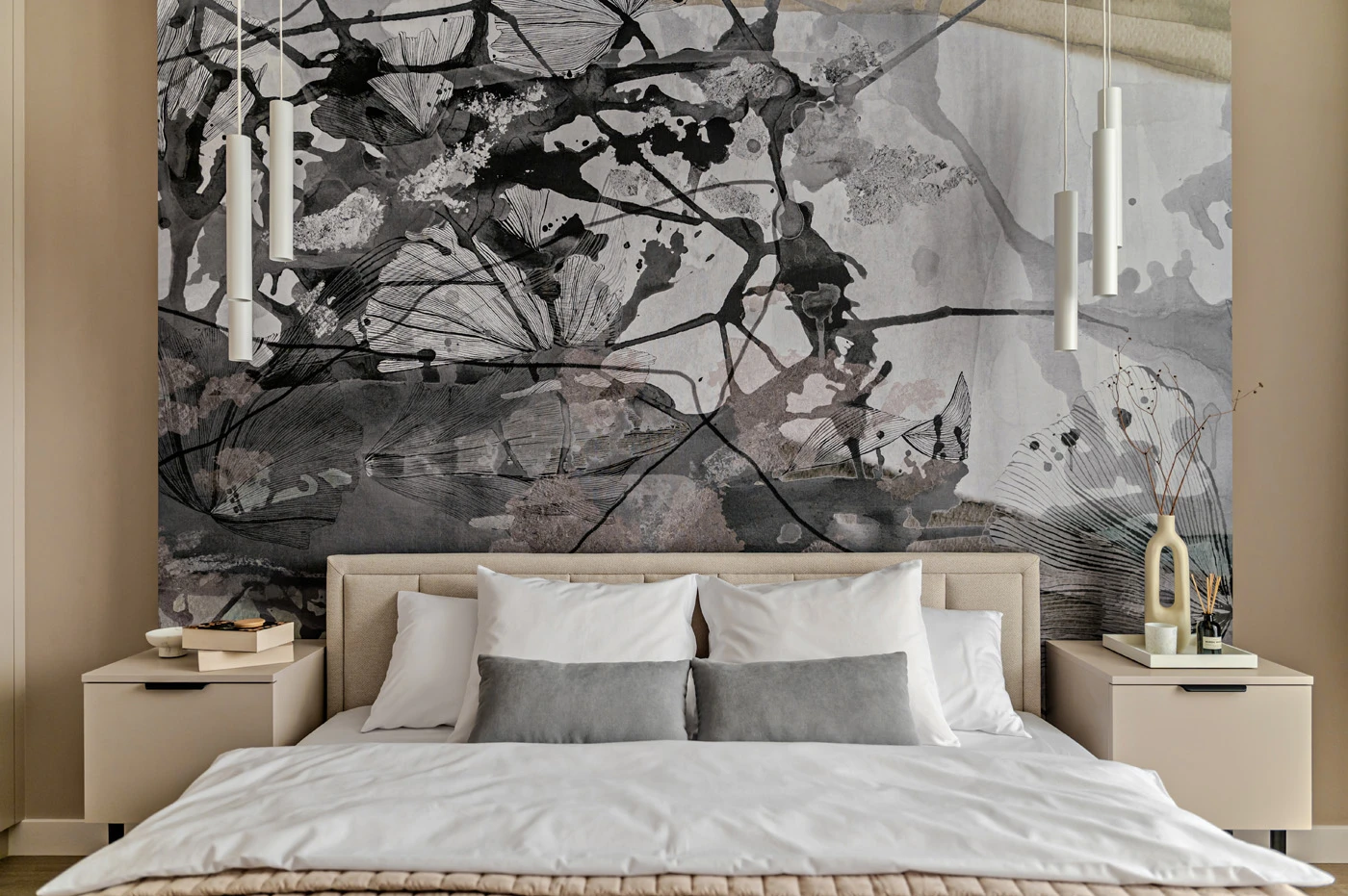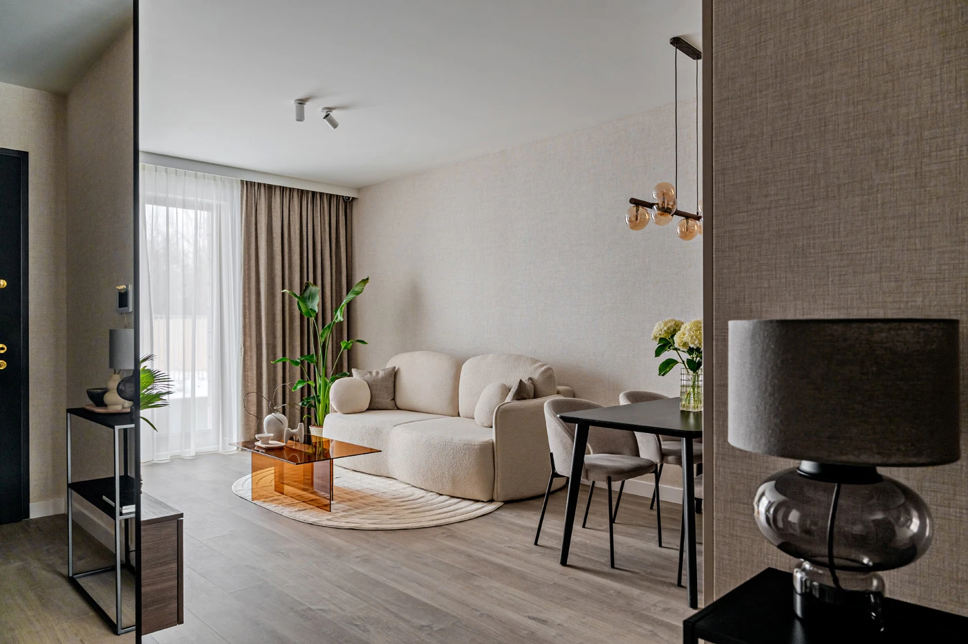 Aranżacja utrzymana jest w stylistyce nowoczesnej z dyskretnymi odniesieniami do klasyki. Proste bryły mebli ruchomych zestawiono z formami o miękkich liniach, co wprowadza zróżnicowanie bez nadmiernej ekspresji. W sypialni za łóżkiem zastosowano przedściankę eksponującą abstrakcyjną tapetę, która stanowi wyrazisty akcent w stonowanym otoczeniu.