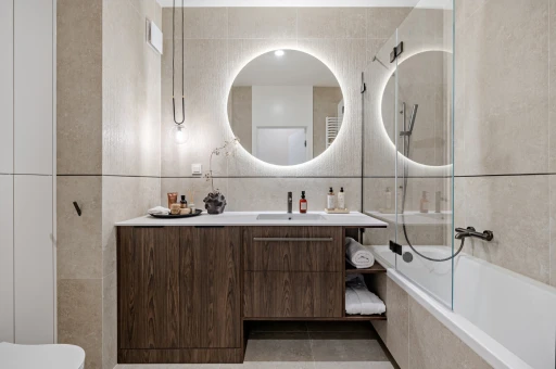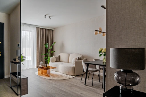 Układ funkcjonalny mieszkania odpowiada standardowi inwestycji, dzięki czemu potencjalni nabywcy mogą realnie ocenić możliwości aranżacyjne lokalu. Wprowadzone modyfikacje mają charakter kompozycyjnych akcentów, a nie głębokich przekształceń. Materiały wysokiej jakości nawiązują do tych zastosowanych w częściach wspólnych budynku, co podkreśla spójność estetyczną całego przedsięwzięcia.