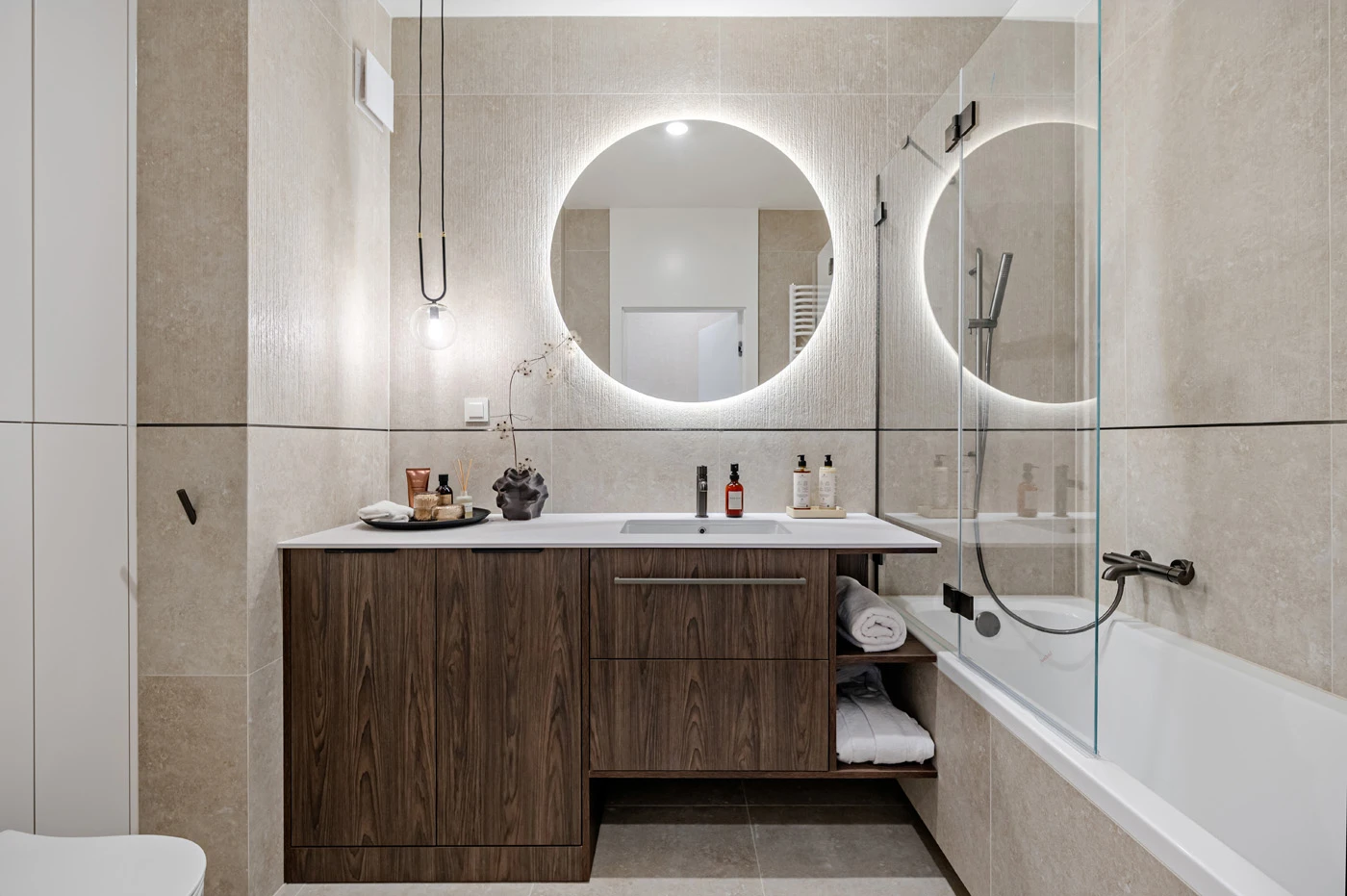 Zabudowy meblowe wykonane na wymiar integrują funkcję przechowywania z estetyką wnętrza. Matowe fronty w popielatym odcieniu harmonizują z panelami podłogowymi oraz armaturą w stalowo-grafitowym wykończeniu. Ograniczenie kontrastów kolorystycznych kieruje uwagę na subtelne różnice w fakturze i sposobie odbijania światła.