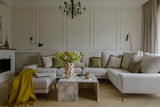 Florystyka to nie tylko zawód, ale sposób postrzegania świata - przez fakturę, zapach, gest. Dlatego projektantka chciała, by mieszkanie było jak ogród zimowy: pełne światła, ale nie krzykliwe, harmonijne w proporcjach i kolorach. Dominują beże, ciepłe szarości i naturalne tony, które stapiają się w spójną, miękką całość.