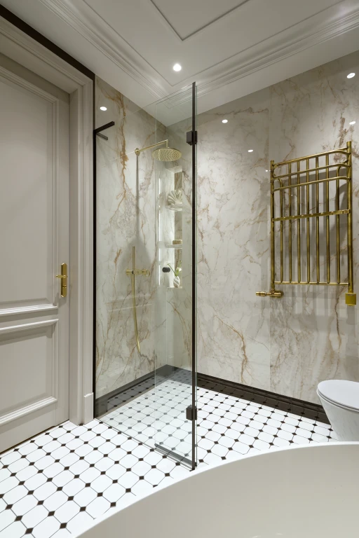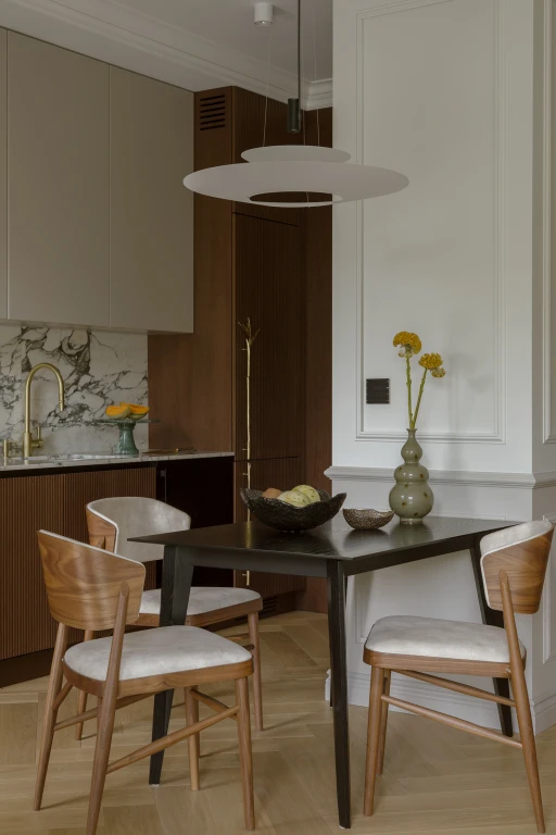 Kiedy słońce chowa się za wzgórzami, mieszkanie zaczyna żyć nowym rytmem. Delikatne światło rozlewa się po ścianach, odbijając w marmurze i złotych detalach. To nie przypadek - scenariusze oświetlenia zostały precyzyjnie zaprogramowane w systemie Gira KNX, który pozwala sterować natężeniem, temperaturą barw i roletami jednym dotknięciem.