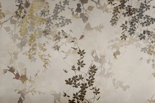„Ampelo” jest wizualną metaforą jesiennego poranka – mglistą, pełną światła i refleksów. Liście wijących się pnączy tworzą subtelne warstwy, które stapiają się z tłem niczym cienie poruszane lekkim powiewem wiatru. Efekt półprzezroczystości nadaje kompozycji wrażenie głębi, a zarazem ulotności, jakby czas na chwilę się zatrzymał.