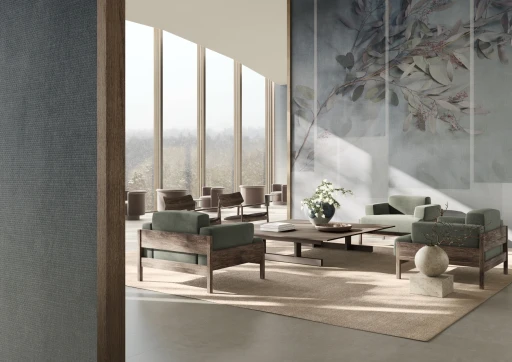Charakterystycznym elementem „Bagliori e Ombre” są pionowe, półtransparentne pasy, które porządkują kompozycję. Ten geometryczny podział działa jak filtr światła – dzieli ścianę na strefy, w których botaniczny motyw raz jest wyraźniejszy, raz niemal zanika.